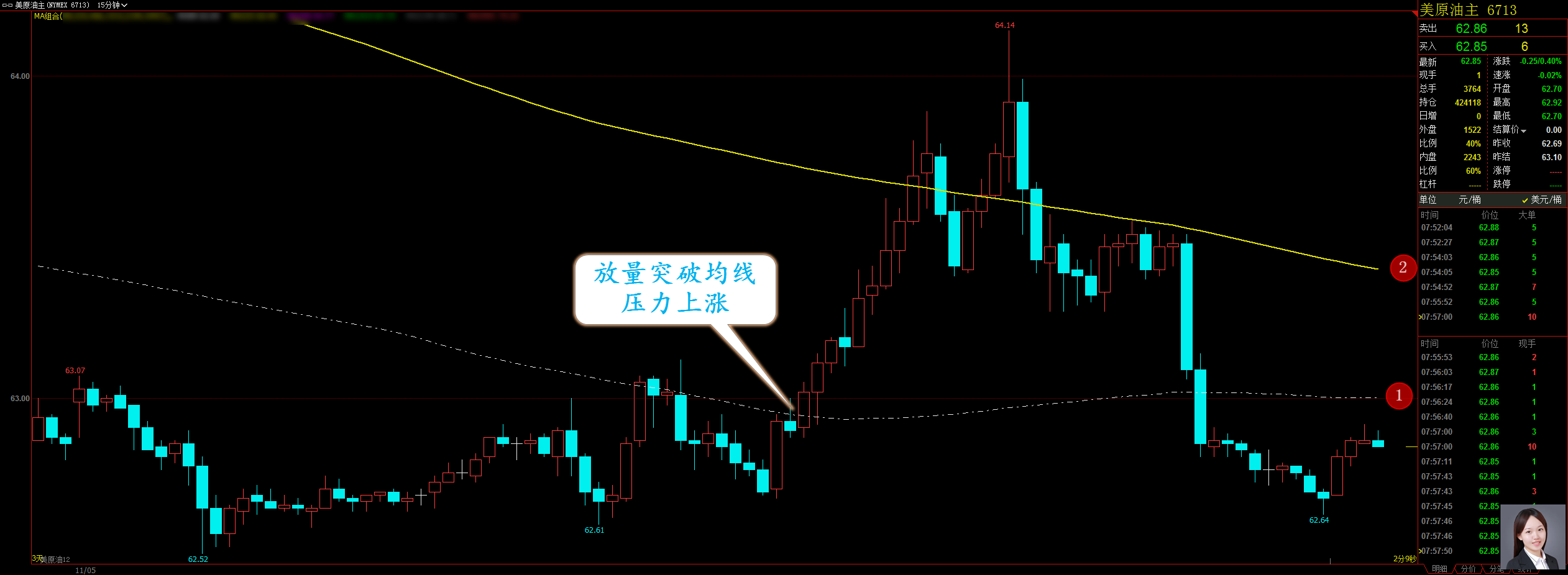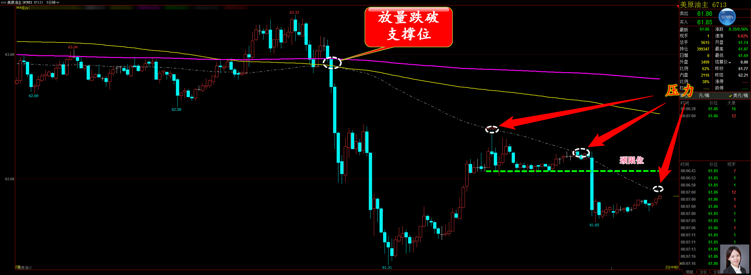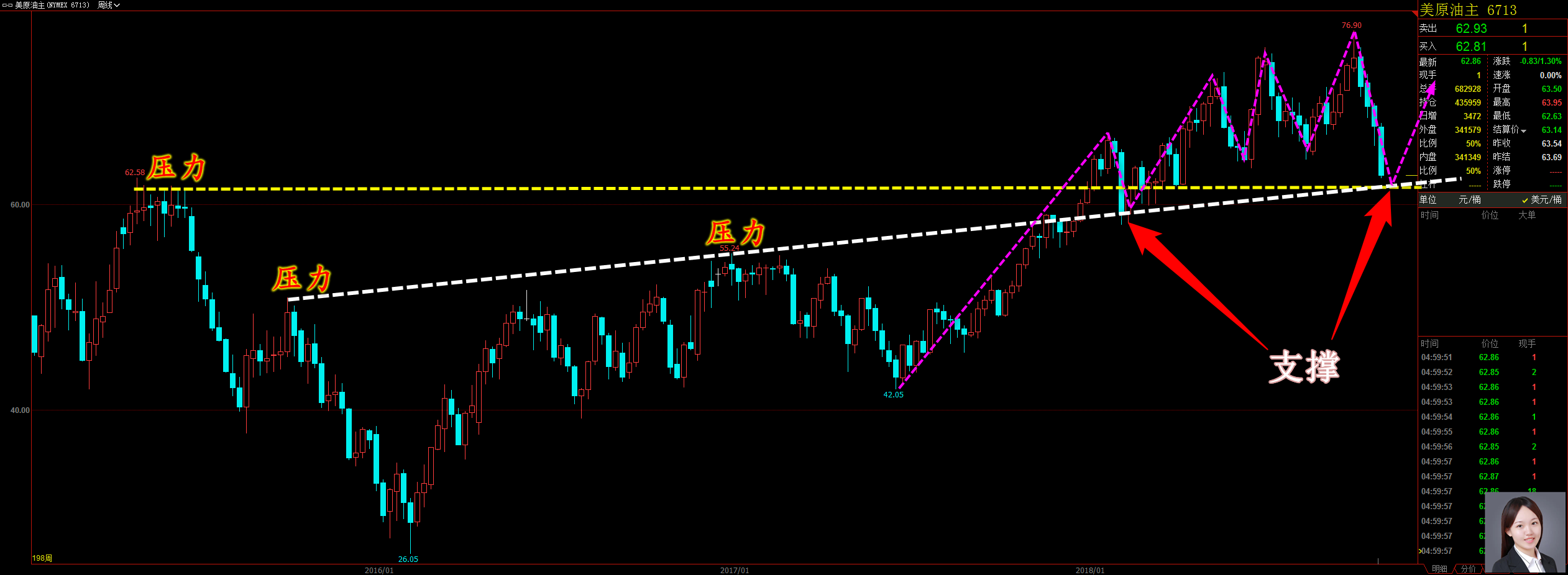 家人们好,我们家上周最后一个交易日的表现非常稳健,黄金 8 美金的盈利空间也是很满意的,还有说一点,外汇我们上周五赚了不少,还有欧纽的两个空单在手( 1.71058 、 1.71423 ),原油 65 点的利润也还行,毕竟行情不是特别大。这里总结一下,近一个月来我们单日结亏下来的单子已经很少了,就我记忆中的应该没有超过 5 天,所以家人们放心,只要按我短信去操作,一个月下来只可能是赚的远比亏的多。 通过对黄金 2 小时图解析得知前几个交易日行情放量突破趋势压力线,目前行情受制于上方均价线的压制冲高回落,目前从 K 线的力度来看上涨的 K 线力度小于下跌的 K 线力度,当下整体行情依然
