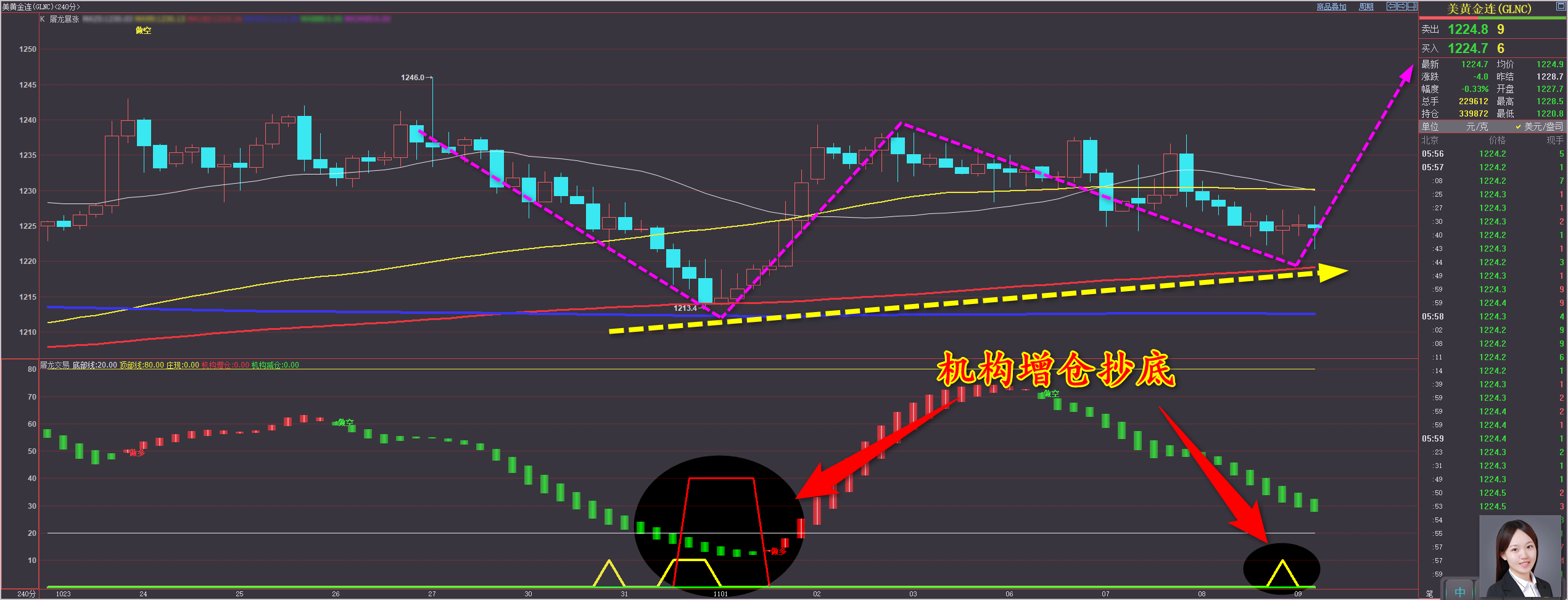 各位家人们好!通过我细心地发现,黄金已经出现了抄底的信号!久违的绝技神单已经出现,在前期有过一次抄顶绝技的操作,今天我们再次发现我们久违抄底绝技今日终于浮出水面,很多人在质疑我们行情明明是下跌走势怎么看都是不可能上涨的,而我今天告知我的家人我们的抄底绝技就今天再次启用! 通过对黄金小时图解析得知,首先第二张图所示在四小时级别当中出现了机构抄底信号,在整体上升趋势完美的情况下出现抄底信号是我们最佳的抄底机会,其次再看第一张图,目前行情运行在前期底部行情上涨突破的位置昨日在最低点得到了强有力的支撑,行情在底部区域反反复复的震荡目的就是筑底告知我们行情启动上涨信号,凌晨利率决议让我们坚定行