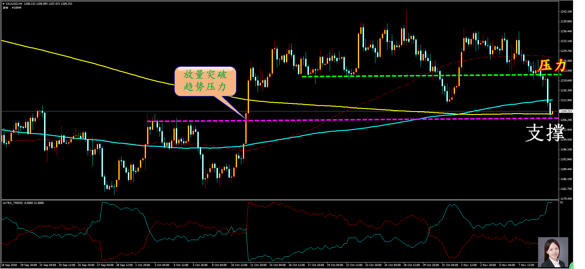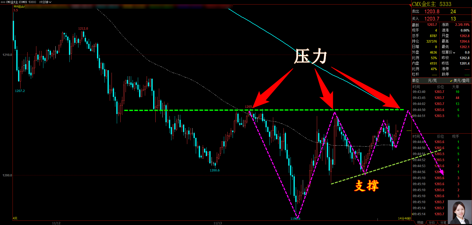 家人们好,上周五我的绝技单可谓完败,我判断的机构主力进仓其实没有错,金价在亚市上午盘后也出现了明显的上涨,欧盘中金价小幅震荡,也并未打破我的策略范围,知道欧盘下午盘,也就是美盘开盘后,金价的跌幅开始扩张,此后美国 10 月 PPI 数据出炉,大幅利空的消息导致黄金崩盘。 通常状态下,我的绝技单出错的概率相对低,本次失败我只能说是我判断上过于激进了一点,也可以说我是被市场诱空了。今天我们通过对黄金 4 小时图解析得知,在前期底部放量突破前高压力,近期反弹遇阻冲高回落目前回到前期的突破位,现在反变为支撑位,同时也受到了均价线的支撑也会有所反弹,重点观察上方压力位能否突破,目前整体依然保持