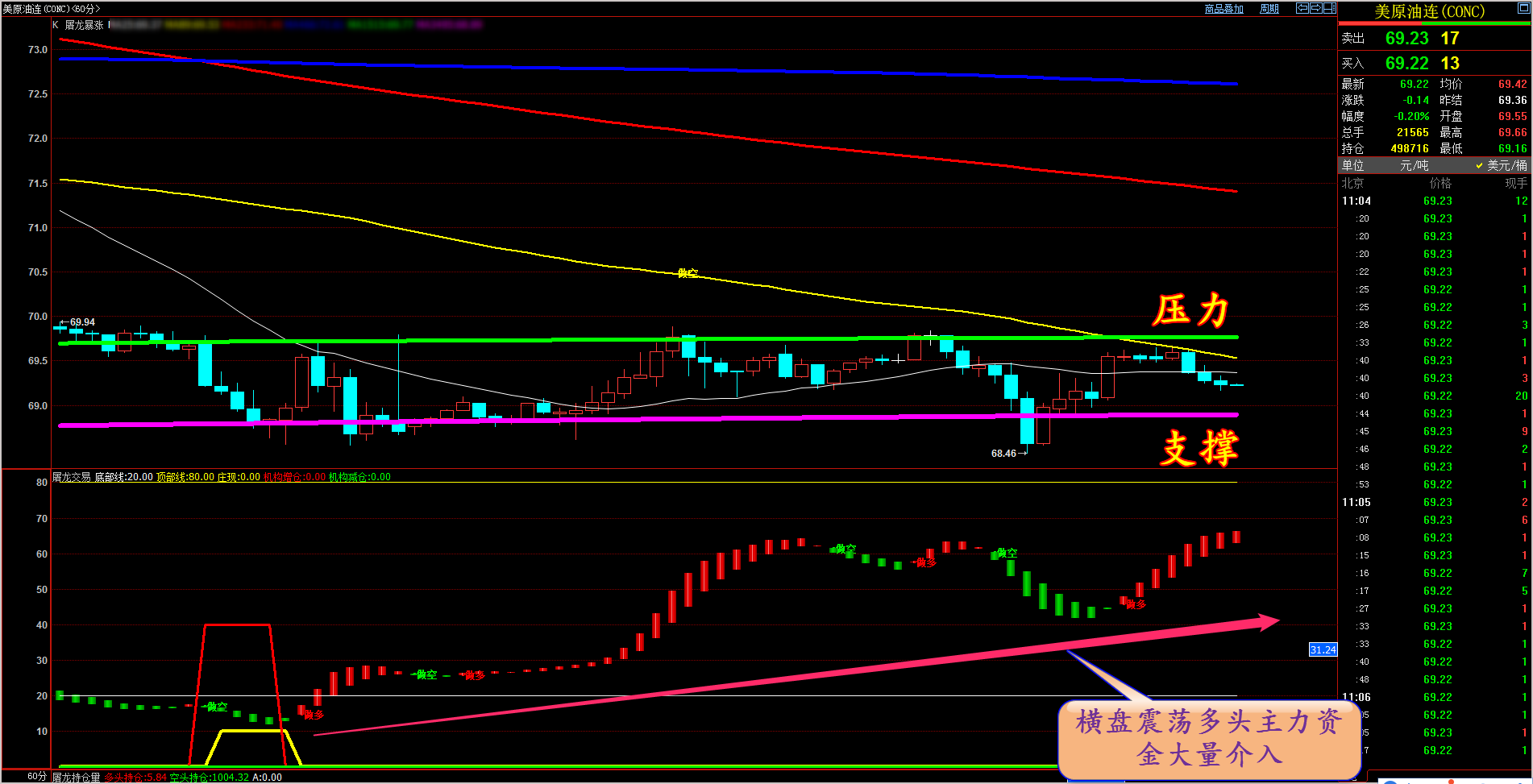 家人们好,上周末我们的几个单子没有做好,导致黄金只盈利了一美金,还有两个 1226 附近的空单持有,原油赚了 186 点,外汇有亏 72 点,但有瑞日的两个中长线单持有,这个我们不去管它,上周末我们做的最好的当属港股,那个赚了 881 点,本周又是一个新的开始,今天由于暂时缺乏来自美市盘面的投资情绪,所以亚盘理应清淡。 黄金这几日一直处于横盘震荡区将也正如我们前期说过技术性修复,我们通过黄金小时图的资金的监测发现星期五行情再回落的时候,就已经发现多头主力在增仓并且已经走强,并且受到 60 日均线的支撑,预计再次回到下方支撑位使我们建仓的绝佳机会,,具体建议如下: 短期: 1. 黄