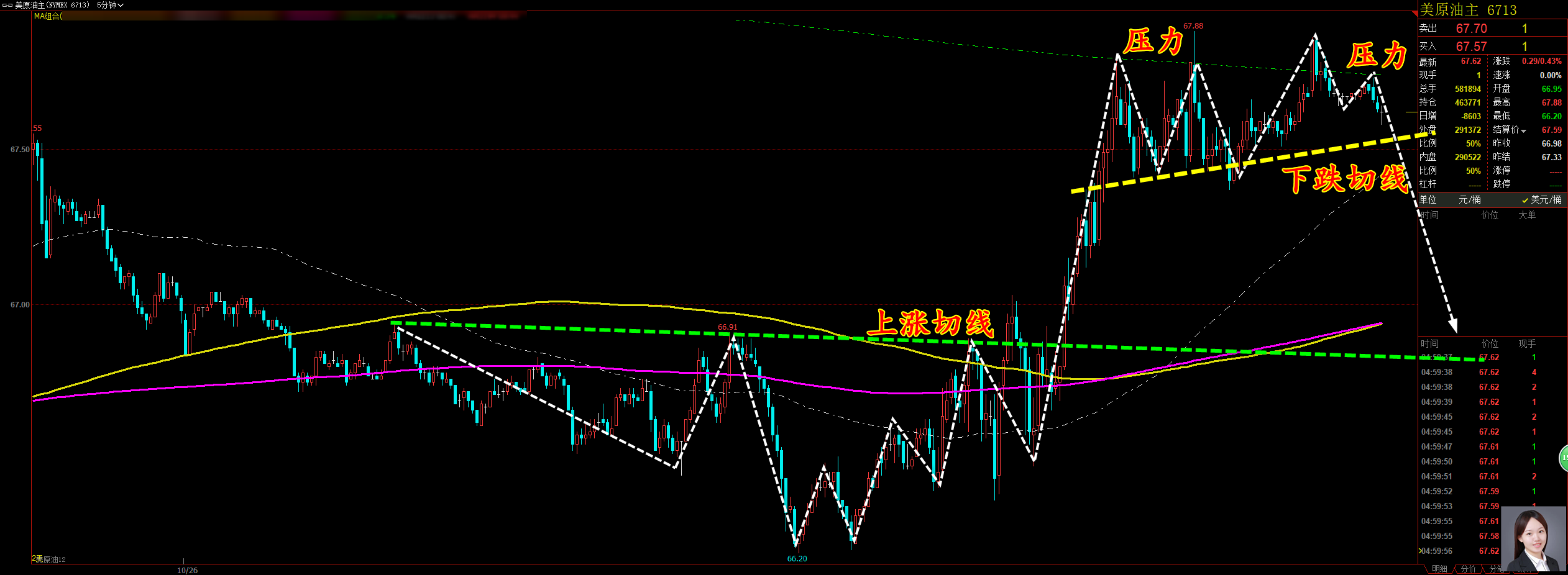 各位家人们好 ! 上周五我们如期大赚 ( 所有品种 ) ,黄金 13 美金及原油 4.3 美金的利润也是再度成为全网之最,外汇 308 点和港股的 453 点利润属于正常水平,不仅如此,我们现在手头上黄金还有 1227.5 的多单、原油 67.58 、 66.48 、 67.4 、 66.73 、 66.9 的 N 个空单在手,家人们如果想先获利了结,可以先减仓,犹豫的话来答疑区问我都可以,总之一句话,赚钱才是硬道理。 黄金方面,由于周一行情比较清淡,所以我们就通过小级别来分析,萍萍黄金 5 分钟图解析得知,前期在底部启动突破上涨,近期所有行情都在启动位置上方运行并且下方都得到了均线系统