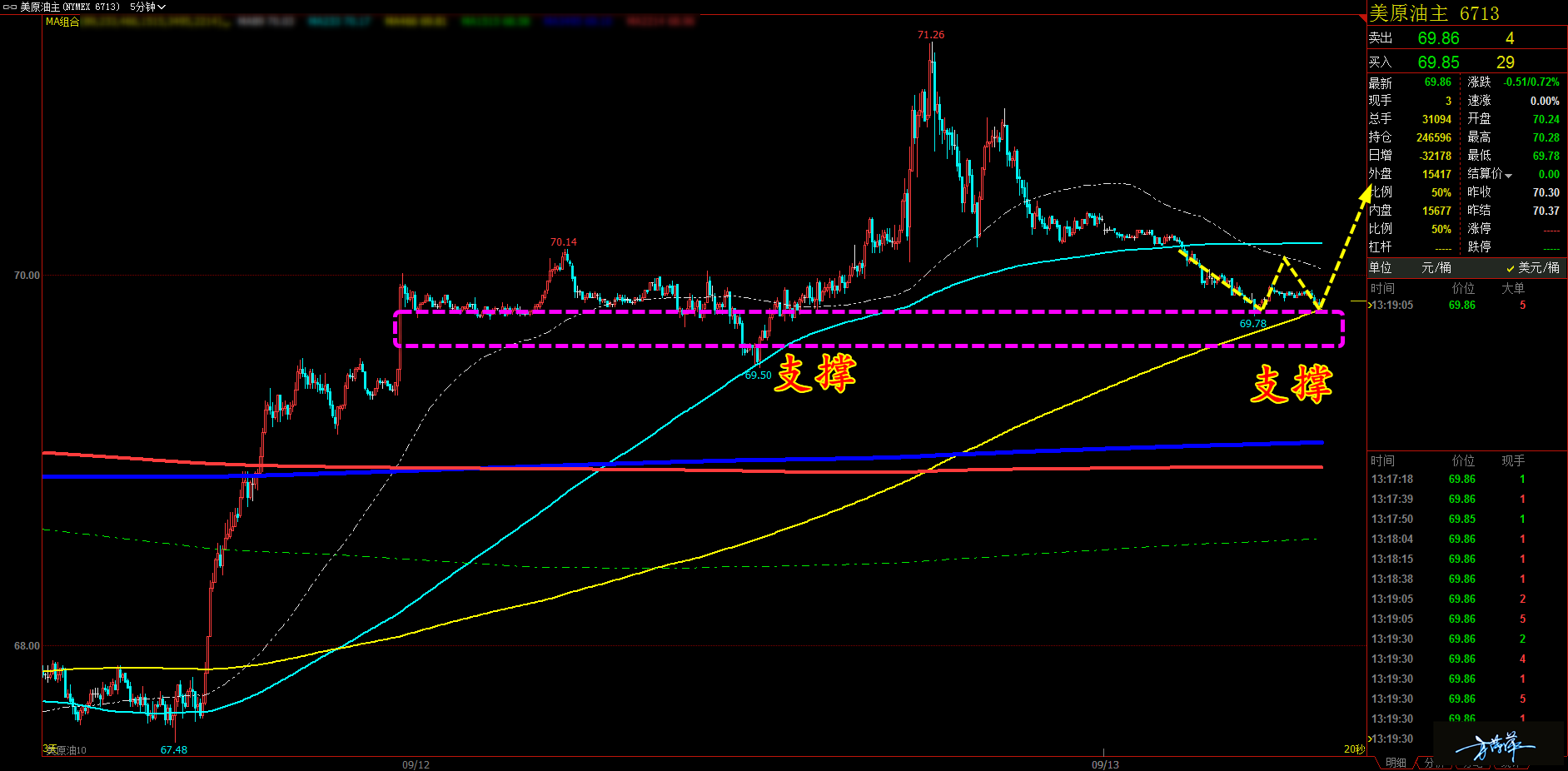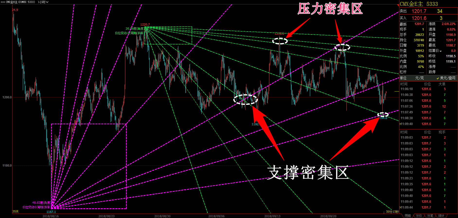 各位家人们好,今日周五 (9 月 21 日 ) ,黄金的行情与前几日有所不同,但大的震荡趋势还是没有变化,不同的是,目前市场多头主力资金有所改变,今日黄金继续上涨是完全可以期待的,操作上还是区间操作的模式,日内以高抛低吸进行。 通过黄金 2 小时图解析得知,前期在行情底部支撑位出现了主力抄底加仓信号,目前一直处于震荡上行之中,同时我们也发现短期多头主力资金大量流入我们重点关注上方趋势压力线压力,操作上我们建议高空低多操作,具体建议如下: 短期: 1. 黄金 1201(1207) 做多,止损 1197(1201) ,目标位 1209(1215); 2. 黄金 1213(1220) 做空,止