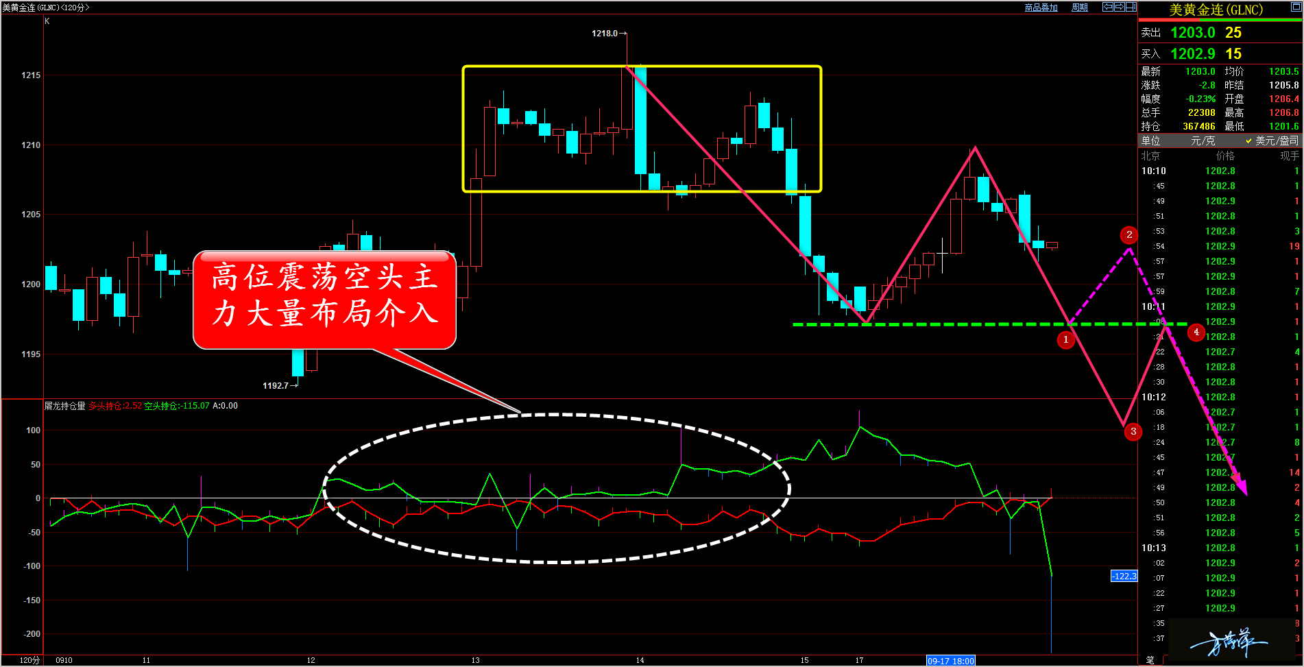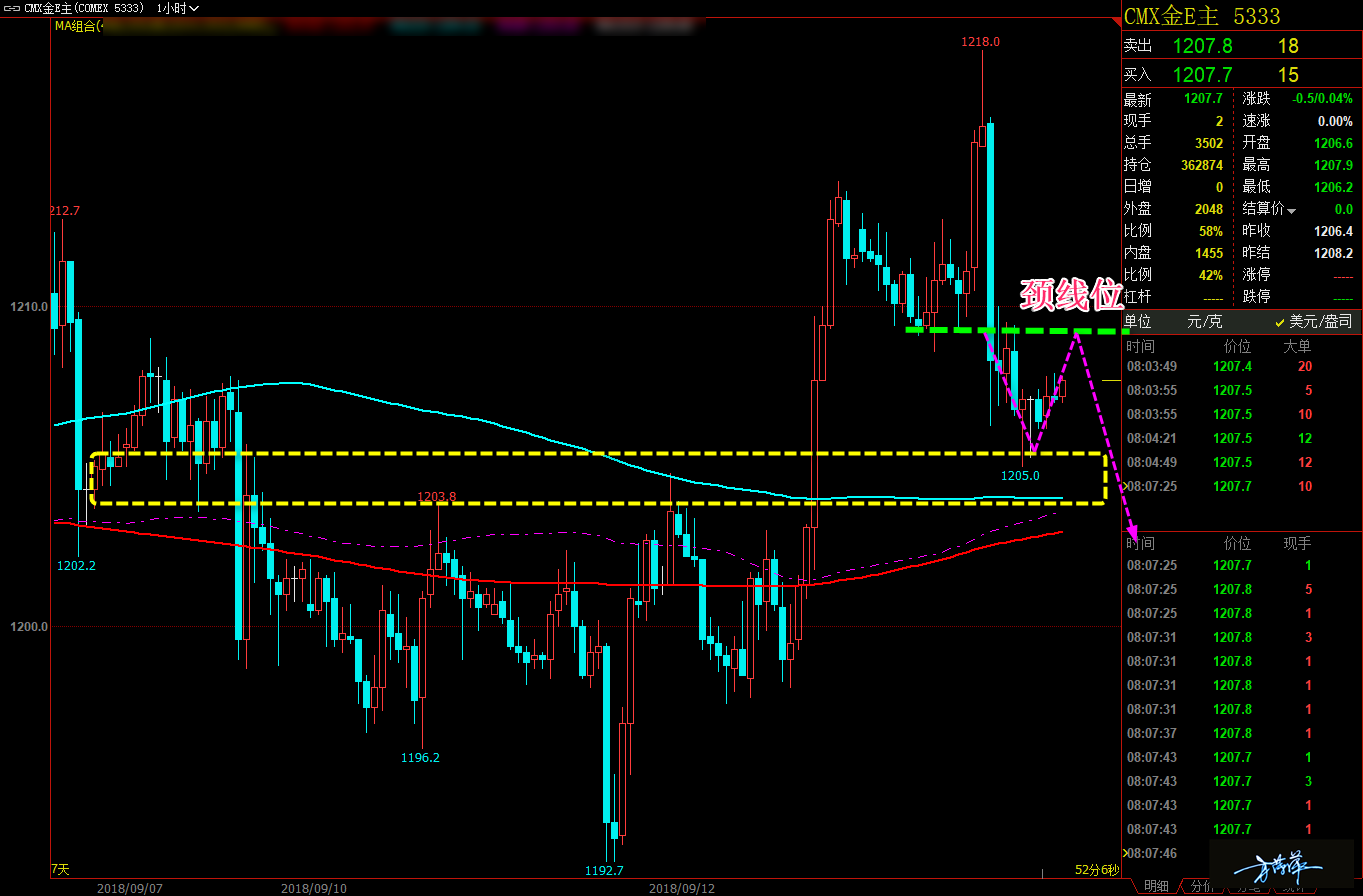 各位家人们好,黄金昨日的行情就如同我在昨天文章所说的那样,基本上与本周之前的几个交易日雷同,无非是振幅加大,这点我们昨天已经完美调整了进出点位,获利程度依旧保持了稳健。作为我来讲,好不夸张地说,这种震荡行情我是最在行的,今天我们仍将保持此前本周来的操作思路,继续高空低多,家人们请安心操作。 通过对黄金 1 小时图解析得知,昨日行情冲高回落之后,把昨日的多头完全吞噬改变了原有的反弹上涨节奏,在下方得到了前期顶部的支撑反弹上涨,目前反弹颈线位之后继续回落,我们预计会跌破下方的支撑位,在操作上继续高空低多思路,具体建议如下: 短期: 1. 黄金 1205(1211) 做空,止损 1209(12