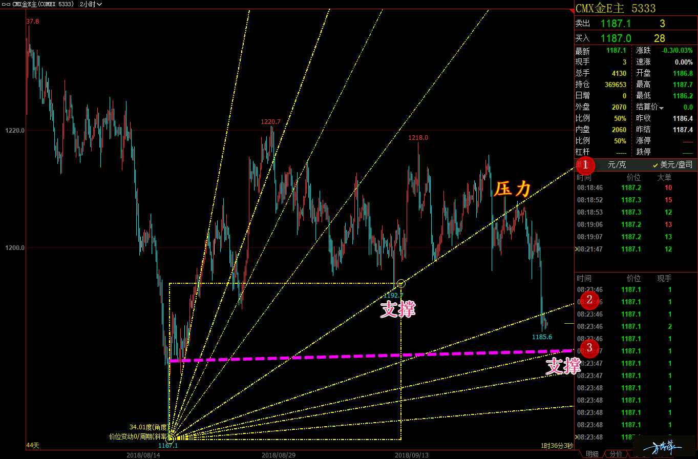 各位家人们好,黄金这两天我们用的甘氏线进行分析,效果也是不错的,其实对付这种震荡行情,萍可是有太多办法的。要知道我们这个月黄金还没有一单亏损呢,这里再次感谢大家对我的支持,有你们的陪伴,我才能有更多的动力去帮大家赚钱,再辛苦再累也是值得的。 通过对黄金 2 小时图解析得知,我们今日继续运用甘氏线解析,行情从底部反弹以来,在高位震荡回落在 1 号中轴线前期在底部构成支撑,行情跌破之后在这里构成压力,目前已经跌破了 2 号支撑位,预计行情在这里震荡继续回落下方 3 号位,同时也是前期反弹筑底的支撑位,在操作上我们高空低多,重点高空,具体建议如下: 短期: 1. 黄金 1185(1191) 做