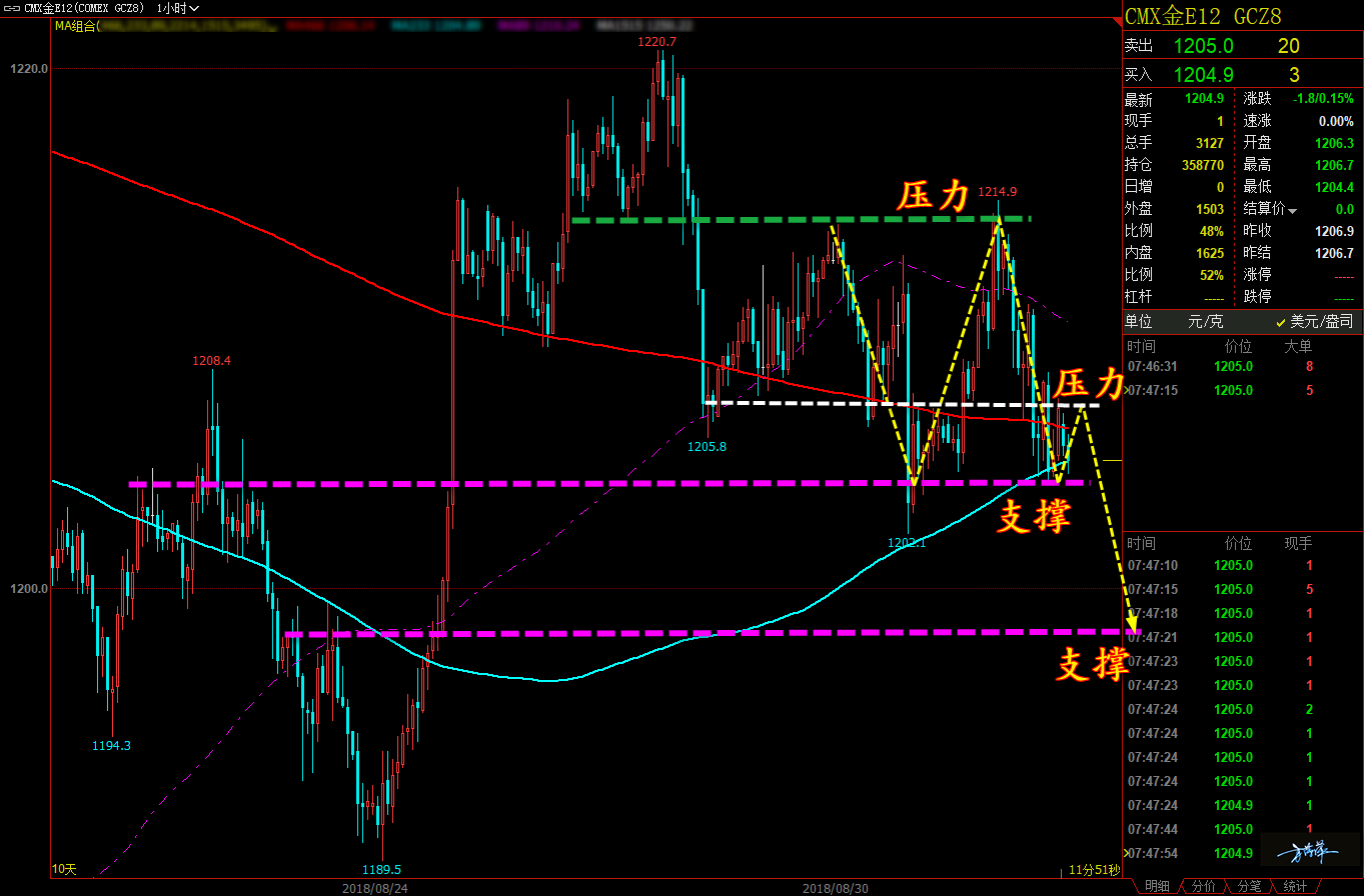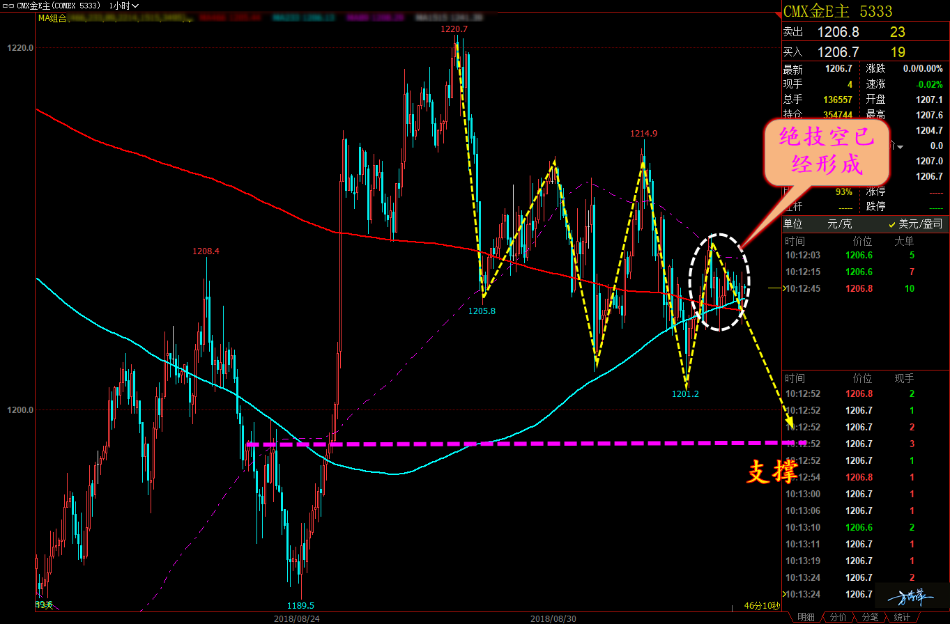 家人们大家好,昨天我在文章中就说了黄金的思路很简单,就是反弹做空,今天来看,我们空头的思路还能更加简单,因为黄金已经符合我们绝技空单的要求了,当然昨天这种要求也出现了,但我觉得稳健一点也好。但是今天就不用纠结了,所以今日黄金萍萍就给一个空单方向,家人们按照我的点位获利后出来就好。 通过对黄金小时图解析得知,近期我们可以清楚地看到黄金从高位回落已经形成顶底下移动作,加上昨日已经符合我们的绝技空的要求,下方直指前期的启动位,在操作上我们继续保持逢高做空思路,具体建议如下:备注: () 里面是美黄金报价。 短期:黄金 1202(1208) 和 1206(1212) 分别做空,止损 1210(1
