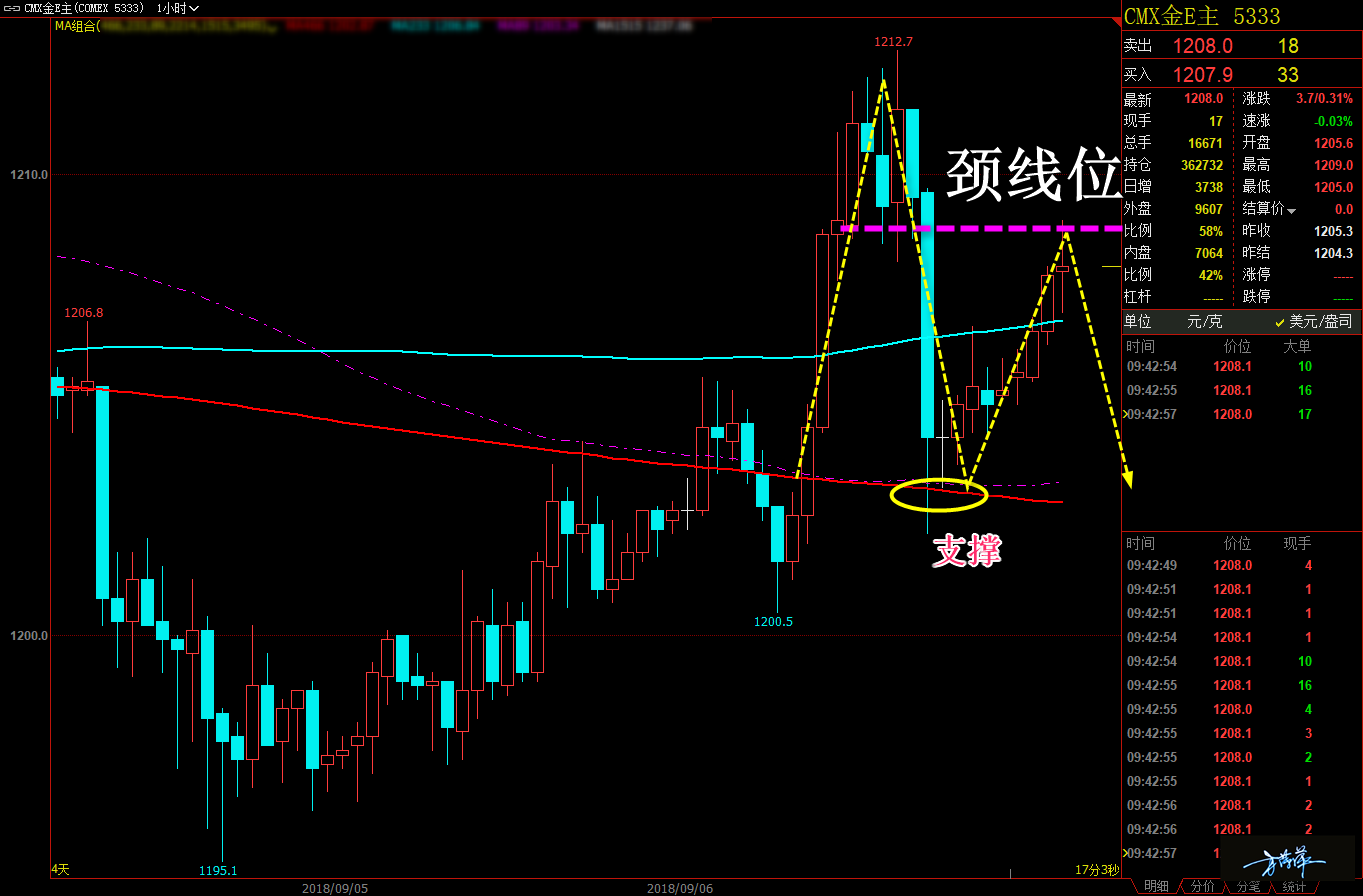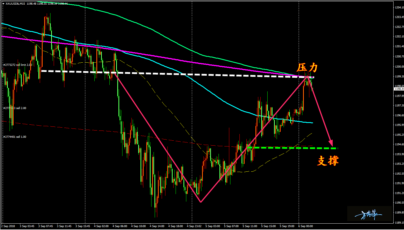 家人们好,黄金从 MA 均线来分析是有短期上升的行情,但是其上方压力也非常明显,由于我的指标都是我自己独创,所以不好透露太多,总之大家相信我的判断,并且要严格按照我的仓位管理来操作,相信是不会亏钱的。黄金我给的方向还是空头,今日的反弹点位我也给出了自己的看法,大家参照着逢高做空吧。 黄金 15 分钟图解析得知,这两日黄金得到 1190(1196) 一线的支撑反弹从明确的空间结构来看金子只是走了一个震荡而已再次回到了前期的颈线位构成压力,同时也受到了均线压制也有回落要求,再从 K 线力度来看前期的下跌阴线大于目前上涨的阳线而且上涨周期大于下跌周期,也是说明有下跌要求,在操作上我们建议逢高做空为