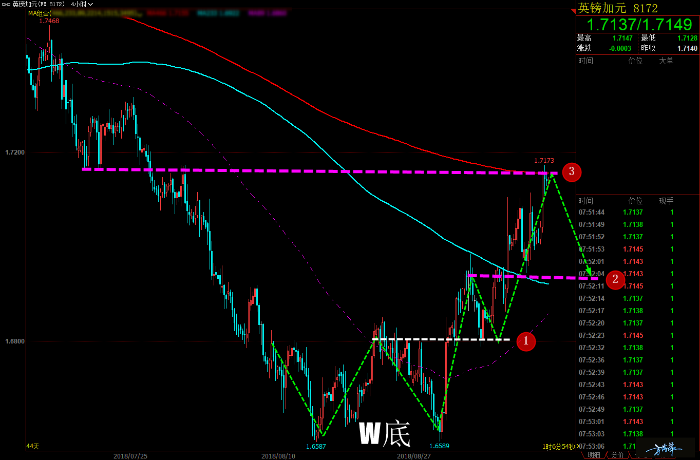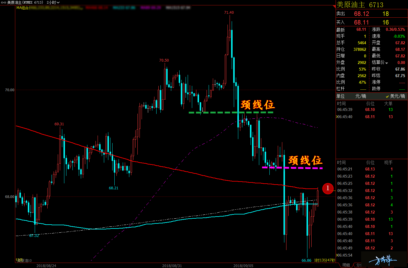 眼下临近 8 月收官,我也给自己的表现做一个归纳,本月的外汇我是让大家有所失望,我自己操作上有因误判而亏损,也出现了没有误判依然不够理想的局面,当然这是进场点位的问题。本月最好的当属港股恒指的策略,对超过 3200 点的盈利空间也是很满意,黄金、原油两个品种有过大起大落,综合来看虽是赢面居多,但看起来还是有些心惊肉跳。 今日来看,黄金日内涨跌幅都不会太大,今晚有初请数据,若数据向好,金价回调幅度或将拉大,但总体上振幅料难扩大。通过黄金小时图解析得知,黄金由前期的高点冲高回落跌破颈线位,到达下方均线支撑位反弹上涨,目前再次到达颈线位,将会压制着他,从 K 线的力度来看能量不足,操作上我们继续保