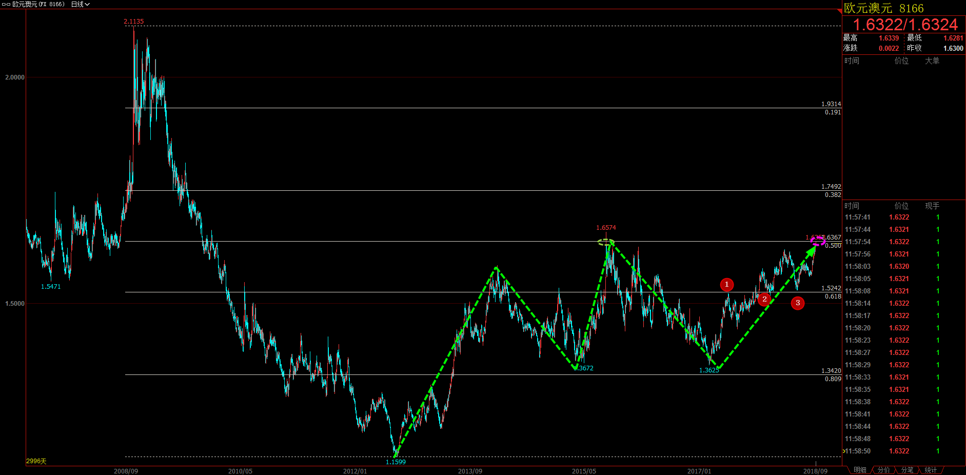 家人们好,昨天的原油我失策了,我知道它要回调,但没想到直接砸下来 100 多点,但是请家人们 放心 ,今天我们就能赚回去,并且我将出条欧系的绝技单,相信就像上周二的欧日绝技单一样,定能让大家赚个过瘾。 黄金我们自不必多说,昨日净赚 36 美金也是冠绝全网,今天黄金我们继续逢高做空,通过对黄金 2 小时图解析得知,行情由前期的上涨趋势,转换成下跌趋势最核心的位置就是 1 号颈线位无突破下降趋势,昨日跌破 2 号颈线位 在 到达趋势通道的下沿反弹上涨,在操作上可在 2 号颈线位逢高做空,目标位下方支撑位,具体建议如下: 短期: 1. 黄金 1195(1201) 和 1198(1204) 分别