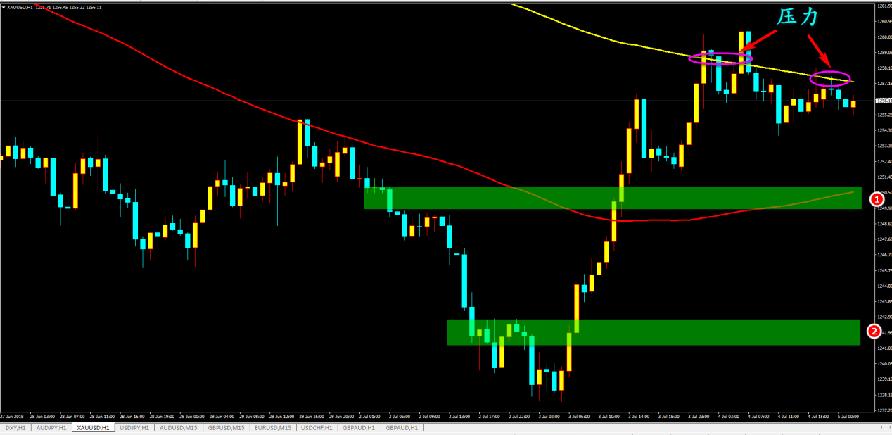 各位家人早上好,当有行情的时候萍萍真的是会自然醒的。对黄金来说,今日萍萍还是一个做空的思路,下方支撑在1251-1252一线,基本面上自中美双方贸易战开打之后,美元指数连续多日走低,将金价提振至1257美元/盎司附近,预计今日黄金还是一个反弹进空的走势。 在黄金4小时图可以清楚地看到前期跌到底部位置发现了有机构抄底介入,引发了一波反弹上涨,目前在高位盘整即将到达上方1号压力位下跌回落,在操作上我们高空低多,重点做空,具体建议如下: 短期:1.黄金1258和1261做空,止损1263,目标位1253; 2.黄金1252做多,止损1249,目标位1256。 中期