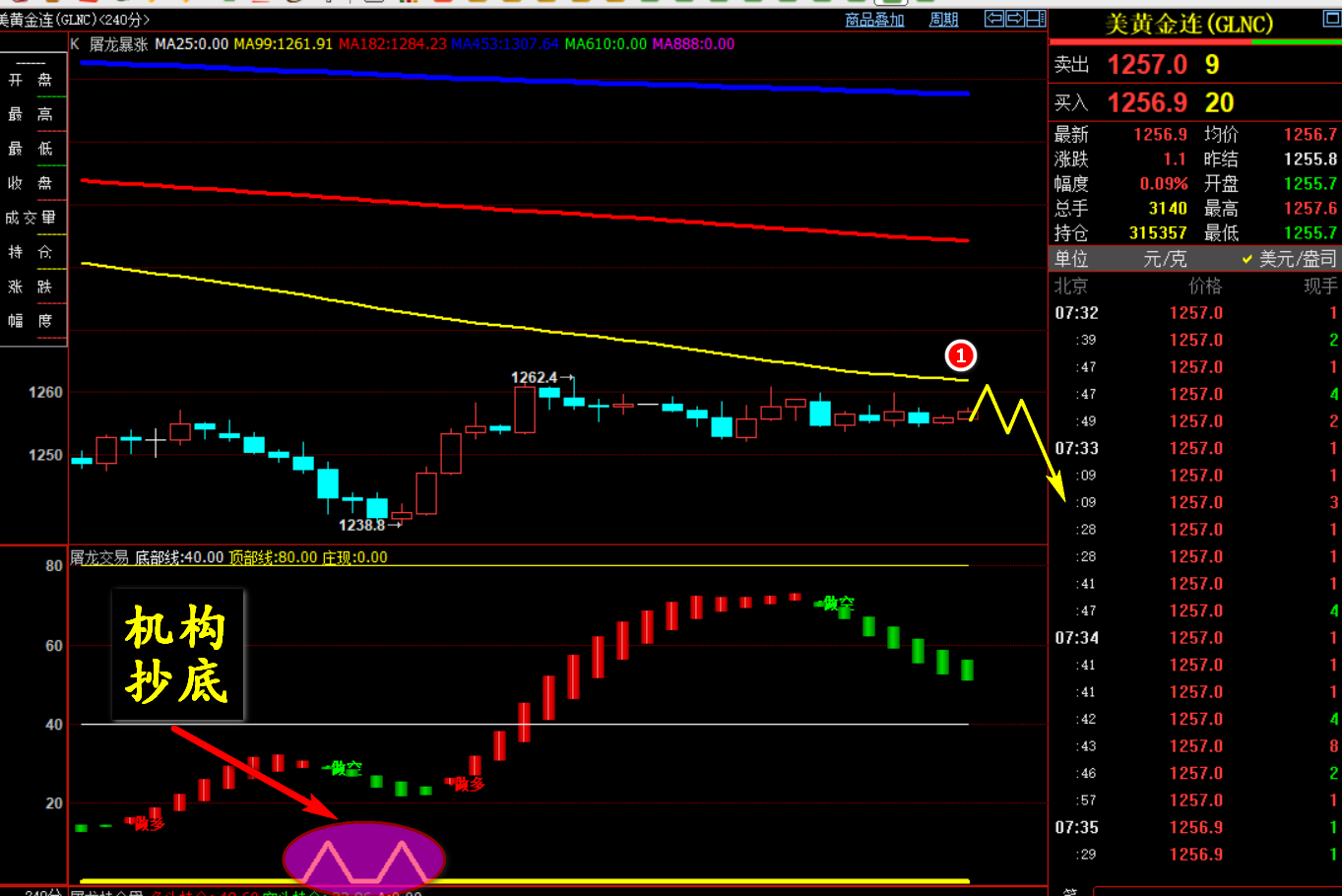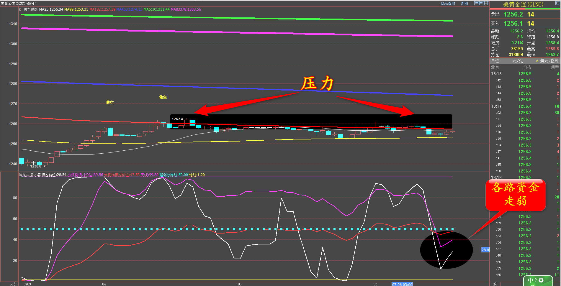大家下午好,萍萍非常满意昨天给的单子,黄金1257看向1250的空单,对外而言属于稳健性的单子,不值得一吹,真正值得自夸是我昨天原油的72.80(74.40)空单,萍萍综合日线级别四个支撑位的情况推断,认为油价已经见顶,而下看71.40(72.70)的单子亦非常精准(离昨日最低点仅相差17点)。 今日而言,萍萍黄金的单子与昨日相距不大,原油方面会多出一个方向,外汇方面萍萍将会回到美日上面,这也是我们近期做得最多的品种,好了闲话就到此为止,具体策略见下文。 通过对黄金小时图走势分析可以看出近期所反弹的高位受到了重要均线的压制回落,通过对各路资金的走势也可以看到大机构