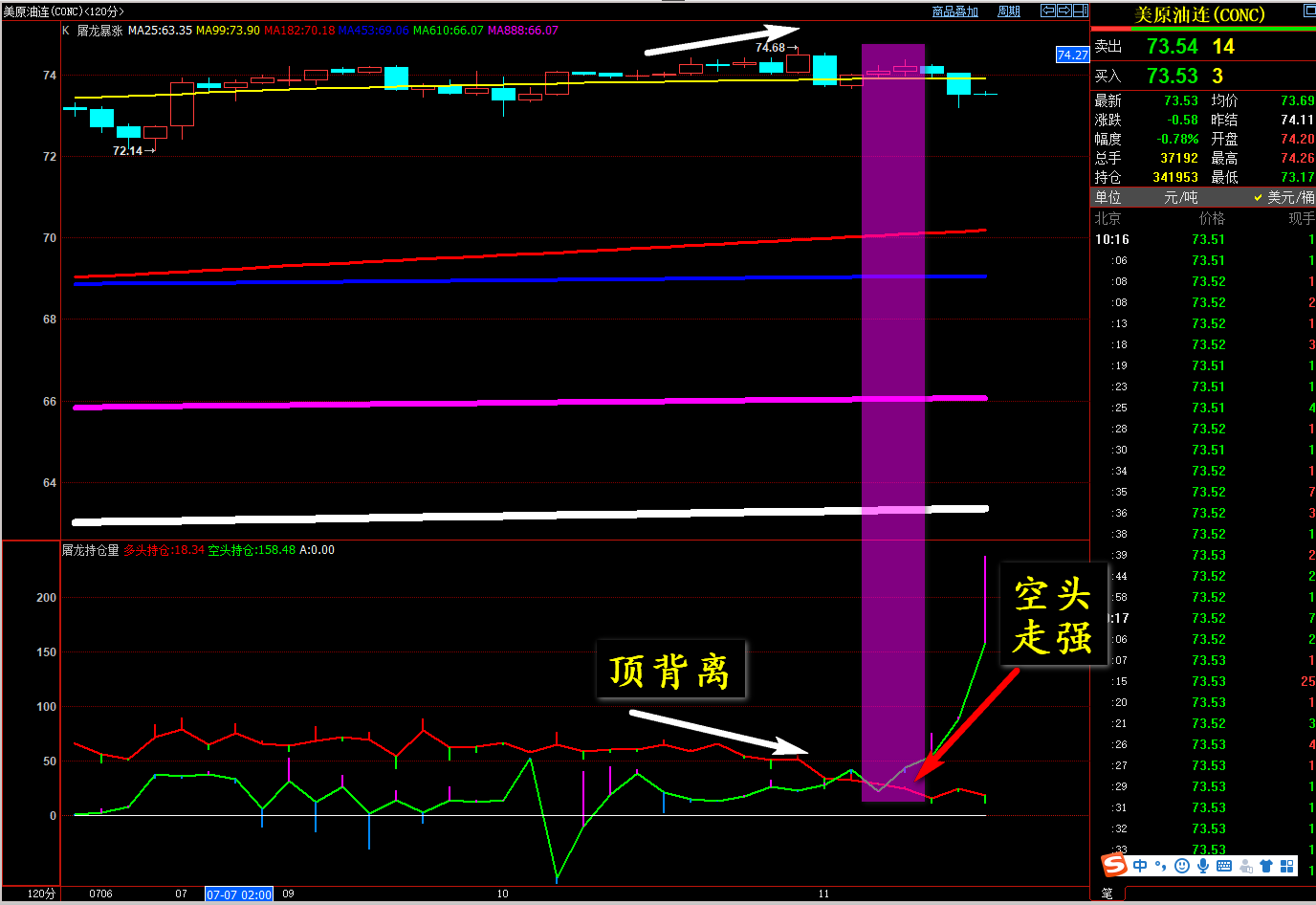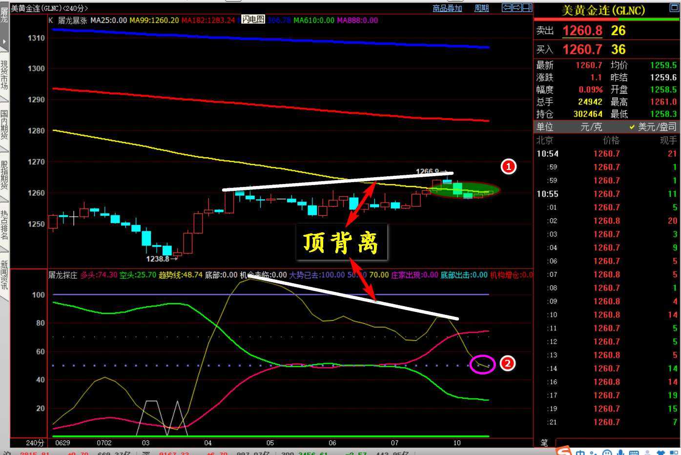大家下午好,上周末我就说过黄金本周将出现暴跌,看向目标位还是我们之前所看到的 1240 ,昨日 (7 月 9 日 ) 黄金价格涨势如虹,很多朋友开始质疑萍萍的方向,这点也可以理解,比较昨日白天时段黄金均处于不断突破的阶段,但美市晚盘期间的行情就开始顺延我的预测来进行。 通过黄金 4 小时图可以看出目前从底部反弹上涨只是属于弱势反弹而已,昨日完成诱多动作,整体还没有扭转下跌命运目前是受到 1 号压力位的压制冲高回落,从趋势上也看到已经出现了顶背离现象, 2 号位已经进入弱势区域,在操作上建议逢高布局大量空单进仓,具体建议如下: 短期:黄金 1260 和 1263 分别加仓布局空单进仓,统一