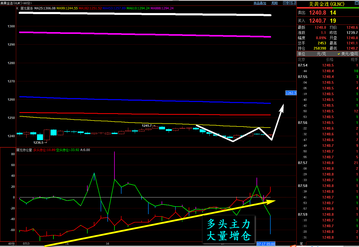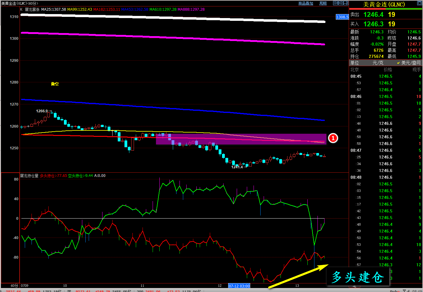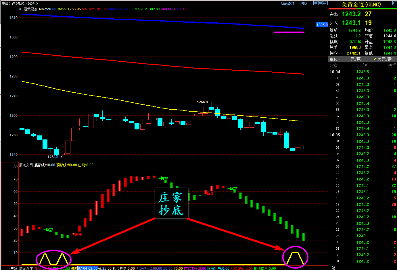 大家下午好,昨天的绝技单如何?这个问题小方已经不用我自己去回顾了,从今天大家对我的回馈中已经可以确定肯定是大赚!周四(7月12日),萍萍认为行情已经较昨日完全不同,这点我在股市中就是看出来,今日亚洲市场上日经、上证股市大涨,与昨日开盘暴跌形成鲜明对比。黄金、原油上也是一样,自昨晚行情暴跌之后,今日庄家抄底信号纷纷浮现,短期内均可看涨。 先看黄金,通过对黄金4小时级别我们再次发现,行情到达前期的启动位出现了庄抄底信号,前期多次提过大量布局空单进仓,现在已经下跌到位,目前我又开始布局多单进仓,具体建议如下: 短期:1.黄金1242做多,止损1238,目标位1248;
