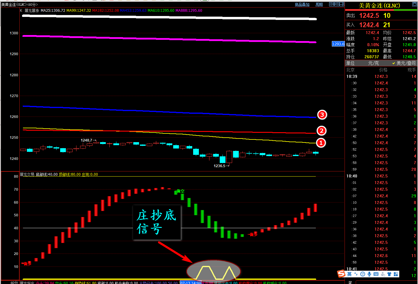 各位好,上周五萍萍黄金1248空、1242多的两个单子比较精准,晚盘美指反弹也未对行情造成多大规模的波动,总体而言就是我的预计范围内,消息面上主要还是因贸易战的影响,市场押注美国经济走强而看涨美元,导致投资者转将美元作为避险资产的人数大增,对黄金价格形成空头,不过上周南非公布的黄金月度产量下降16%,这可能导致未来金价跌幅不至于扩大。 通过对黄金小时图可以发现上周五行情到达底部位置区域发现了有庄抄底介入信号目前多头主力大量介入重点关注上方1、2、3号均线压力,具体建议如下: 短期:1.黄金1241做多,止损1237,目标位1247; 2.黄金1248做空,止损