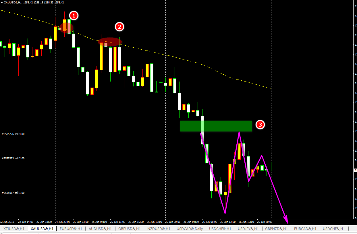 大家下午好,昨天真是急死萍萍了,有朋友跟我说,“方老师,以后你出什么单子我就反着来买”,我说好(气话),结果后来这位朋友晚边跟我说爆仓了.....我早前就说过多次,虽然萍萍很多单子比较激进,但是大方向我是很少出错的,因为我自己这是这样做的,我都没亏,你想你们能亏吗?而上周累计赚的5000美金我自己都很满意,所以大家既然选择了我的策略,就要坚持,我是不可能不为大家负责的。 接下来先看黄金,通过黄金小时图可以清楚地看到这里运行的轨迹,前期行情一直处于下降趋势当中受1,2号趋势线的压制回落,昨日主力走了一个v型震荡,反弹受到3号底的压制冲高回落目前行情已经上攻无力,将会继续回落