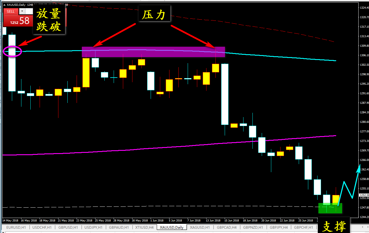大家下午好,上周五萍萍给大家的稳健单子都非常完美,黄金1242和1246分别做多看到1255的两个多单布局精准,原油亦是给的低多单,但是盈利点位仅在60点以内,说真的,这不是萍萍的做单习惯。而外汇中美日的单子也是稳健的高空低多,行情超过了80点,对我而言算是正常盈利的区间。 之前也说了,萍萍会根据大家的资金情况来调整此前相对较激进的思路,就黄金方面,今日萍萍给的单子也是会以稳健为主,而由于当前美市还未完全打开,因此黄金的布局可能会有点早,大家可以耐心等几个小时再行入场。 从黄金日线图分析发现,前期放量跌破均线支撑位,之后反弹至均线受压回落,目前到达下方支撑位得到
