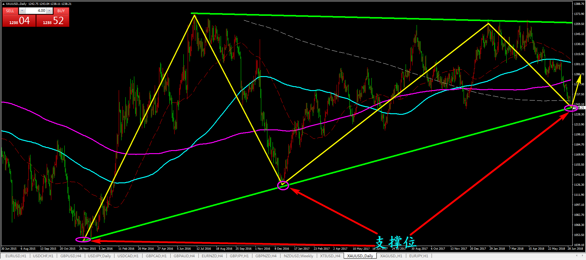 大家下午好,昨天黄金的多空单没有如愿,但迟来的上涨在今日就能看到端倪;美原油料今日将触顶,操作上高空的思路可以先预定好;外汇上面今天萍萍将给美日、欧澳两个品种,美日我们已经连续分析了三个交易日,欧澳是我入主汇通以来的第二次分析,点位方面也会叫熟悉品种而更保守,大家就自己参考着做吧。 萍萍通过对黄金日线级别看出,到目前为止,黄金整体趋势还是处于完美的上升通道当中,目前再次回到趋势通道的支撑位,同时我们监控程序也发现已经有机构增仓和抄底信号,建议布局多单进仓,具体建议如下: 短期:1.黄金1238做多,止损1234,目标位1245; 2.黄金1248做空,止损125