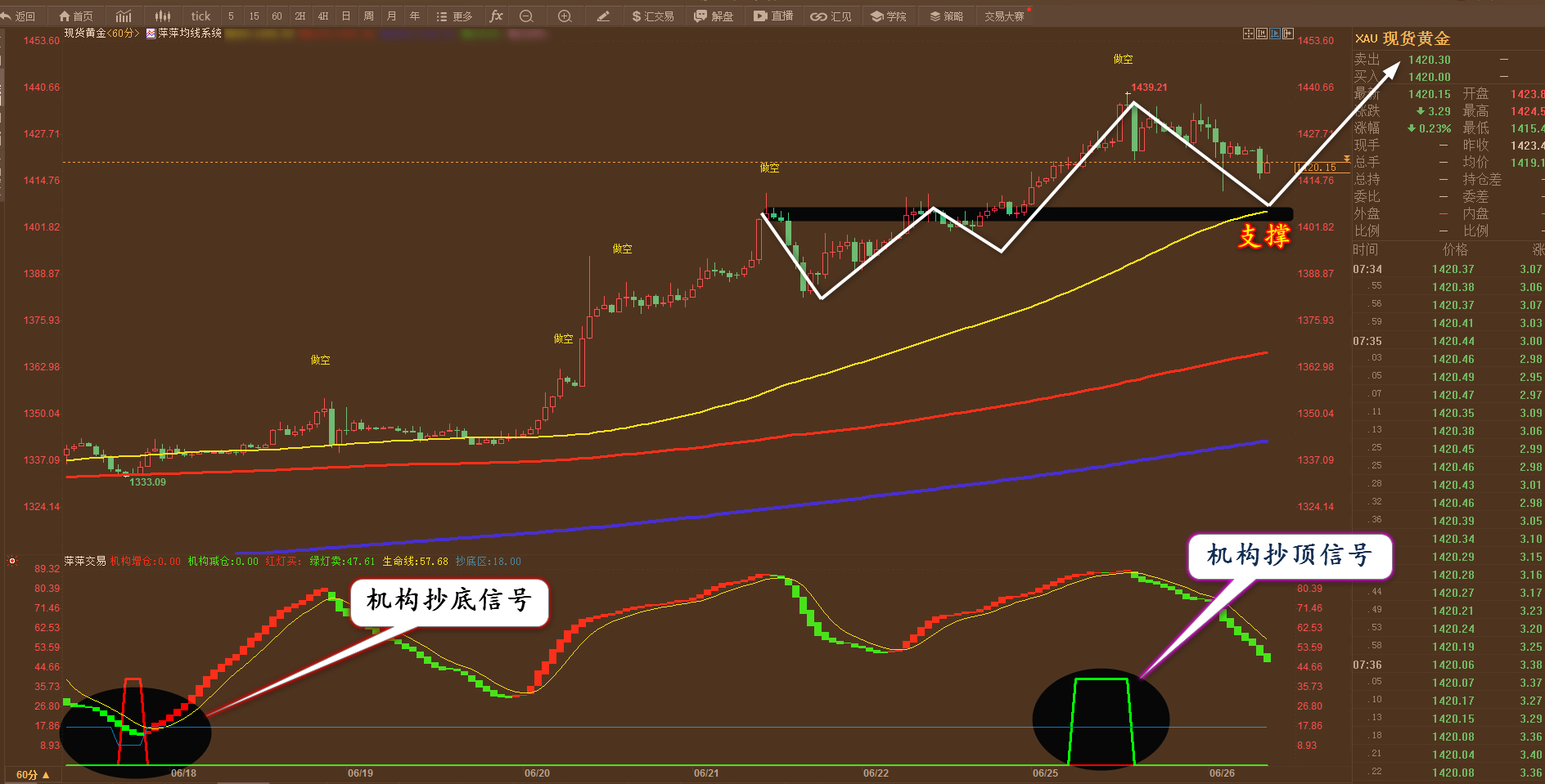 家人们好,原油我在昨天下午就有说要暴涨至少 150点,目前已经实现,今天原油回调做多就好,晚上的EIA有大概率是利多,大家等待时机把握多单机会。 黄金在今天亚市午盘期间两度抄底成功,目前盈利还在扩大 (已超10美金),目标先看到昨天的高位,如果出局,我会提前通知。下午策略我会有更新,需要要的朋友请联系我助理即可。 黄金多头资金出逃 通过对黄金小时图解析得知,昨日行情冲高回落,在高位我们已经发现了多头资金流出逃迹象,并且也出现了机构抄顶信号,在前期底部位置到达均线支撑位出现了机构抄底信号,形成了 100美金的上涨。 目前行情整体依然是上涨行情,我们就等回落下方支撑位逢低做多就好,具体盘中建