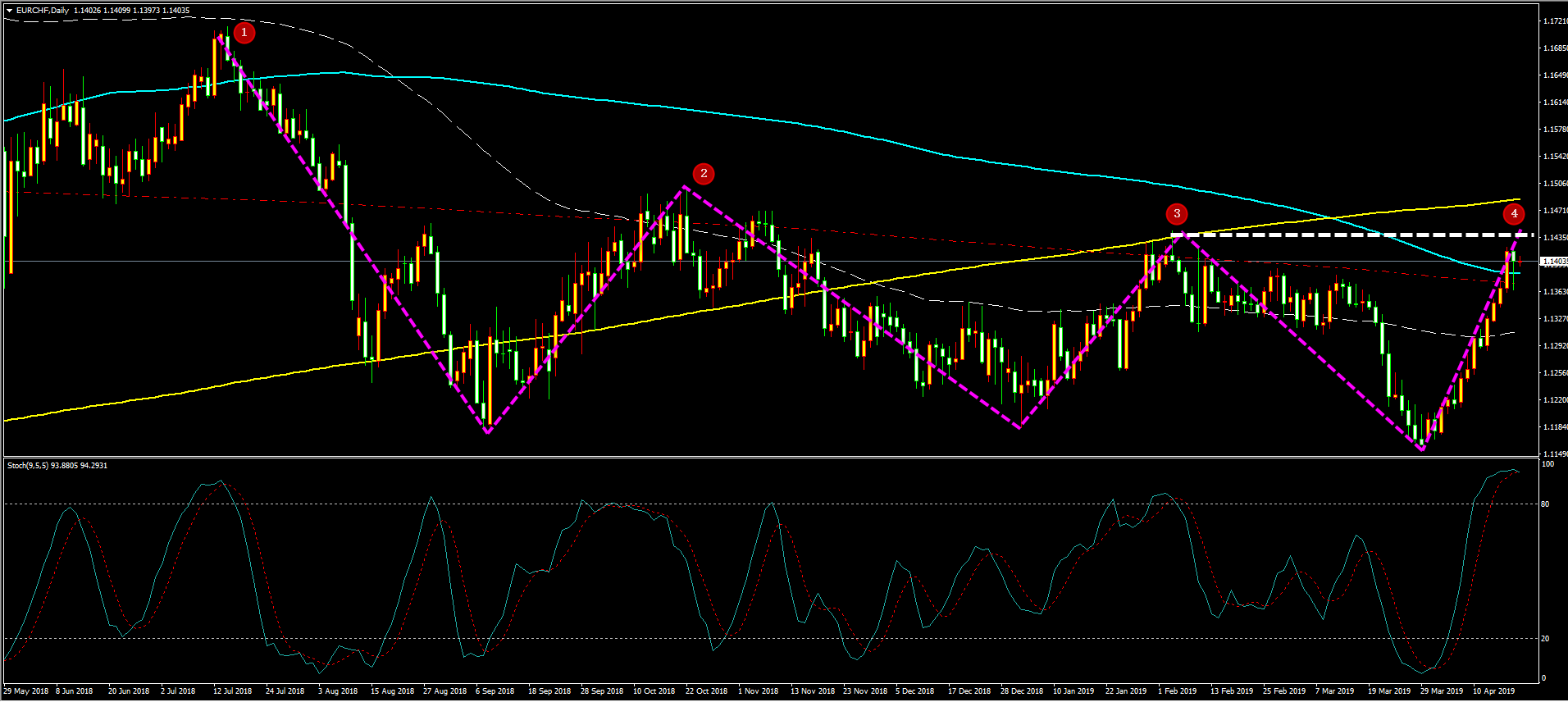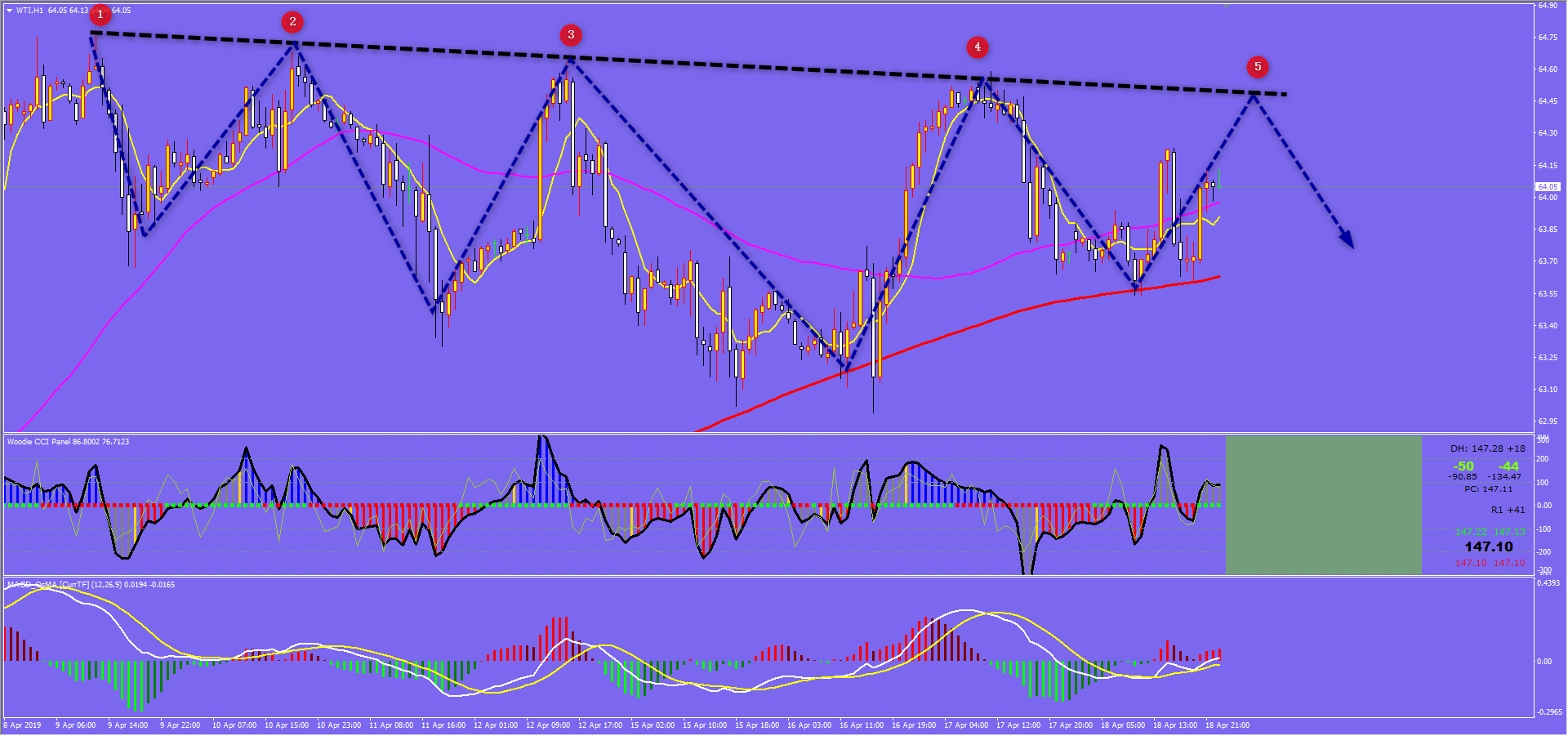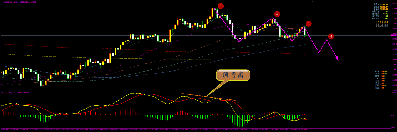 家人们好,昨天我原油在最高点做空又被讽刺了,事实证明我依旧还是对的,那些人真是各种羡慕嫉妒恨。黄金我们的盈利就更大了,本周黄金已经做到了无一单亏损记录, 5 天累计盈利达 76 美金 ! 并且还持有 1310 和 1274.5 的空单,为下周打下良好的操作节奏。 今日耶稣受难日休市,黄金原油全停,就外汇上还有些许波动,所以今天就给写欧瑞一个策略,分析如下: 通过对欧瑞日线图解析得知,从整体走势结构来看前期 1 , 2 , 3 号顶部呈现下移动作,目前行情在 4 号位目前已经接近 3 号位,形成震荡走势,目前 附 图形成死叉有进一步调整要求,在操作上我们高空低多思路具体建议如下: 短期: