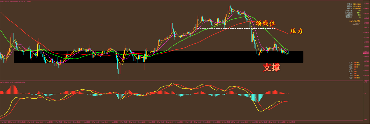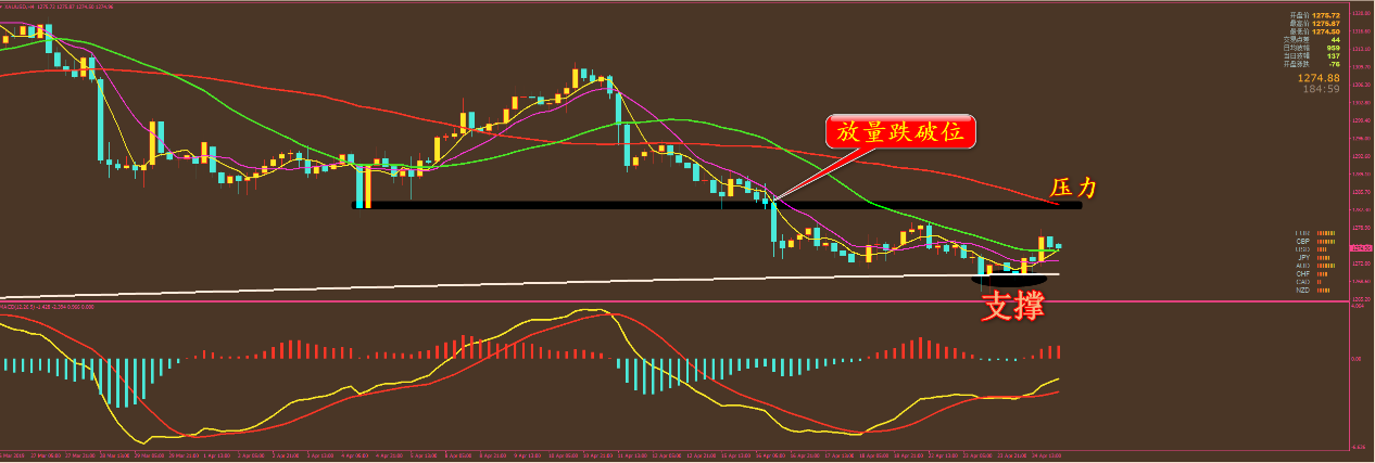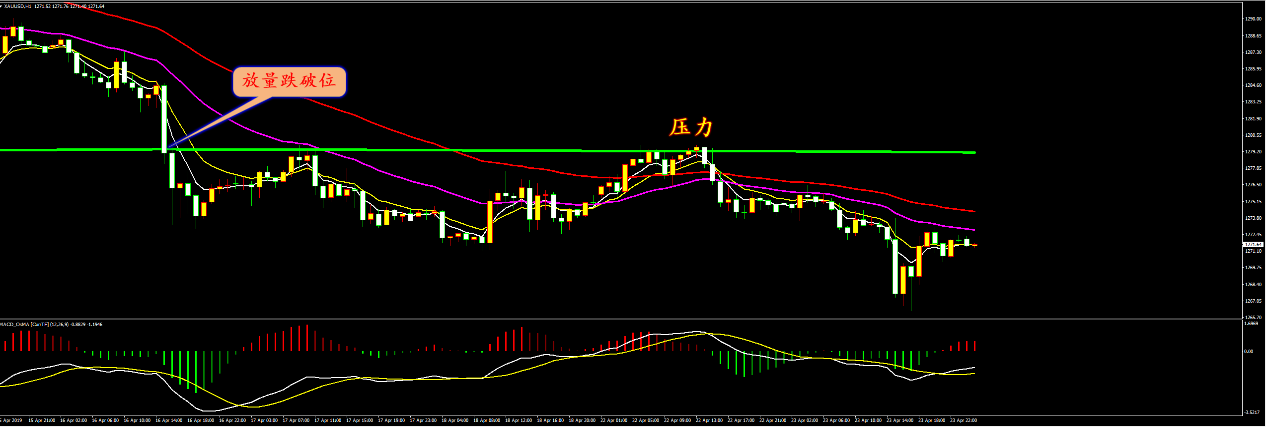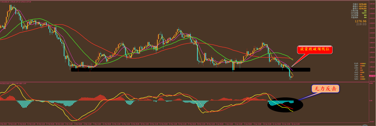 本月我们黄金还没有出现过亏损,昨天黄金盈利 8.5美金,仍然保持了良好的状态,并且还有1273和1270.5的空单持有。原油盈利0.91美金,恒指是在昨天下午获利收手,赚取322点利润。外汇小损12点,但持有的单子先不要动,等我通知后再出。 今天黄金整体还是跌势行情,但能否再破前低还有待观察,原油晚上有 EIA数据,巧合的是,我们这个月的EIA布局还从未失过手,大家晚上留意短信,跟上操作。外汇我们继续在欧系上操作,昨天做了欧瑞的1.1465中长线空单,今天来看欧加。 黄金分析策略: 通过对黄金小时图解析得知,自从行情放量跌破关键支撑位,一直在上方收到这根主要均线的压制,目前行情依然沿着