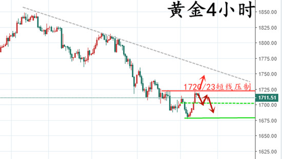 辰逸凛:黄金承压回落,震荡的同时,留意1720下破风险! 辰逸凛记得有一句谚语这样说:你的目光所及之处,就是你将来的去处。井底之蛙,目光所及之处,不过是头顶上方的一块天空;苍鹰的目光所致,是远山的陡峻,眼界有多高,你的格局就会有多大,当你总是和高于自己境界的人做朋友,甚至是做对手你的目光所及,内心所向,便不止于你眼前的温饱和小利益; 市场方面: 上一交易日周四(3月18日),国际现货黄金整体收跌,因美国国债收益率飙升及美元走强打压了黄金的吸引力,而钯金因供应中断引发的强劲需求前景而跃升至多7%。当日现货黄金收报1736.27美元/盎司,下跌8.92美元或0.51%,盘中触及3月1日以来的最高