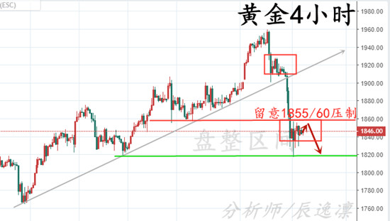 辰逸凛:黄金震荡整理,继续留意高空机会!今日黄金走势分析! 投资是一门艺术,不是感性的决定。对于一艘没有航向的船来说,任何方向的风都是逆风。如果你不知道在这个市场中你要到哪儿去,那通常你哪儿也去不了。凡事预则立,不预则废。言前定则不跲,事前定则不困,行前定则不疚,道前定则不穷。树的方向,是由风决定。现在的你是不是还在迷茫中?无论行情暴涨,暴跌,单边还是震荡,你是不是总是没把握住?就是所谓的一买就跌,一跌就割,一割就涨,一涨就追,一追又套,一套再割。那么此时的你缺少的是一个好的领路者。 市场方面: 上一交易日周一国际黄金尾盘在1845美元附近窄幅震荡,早盘时刻一度回落触及1816美元一线,为去
