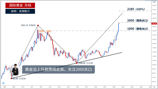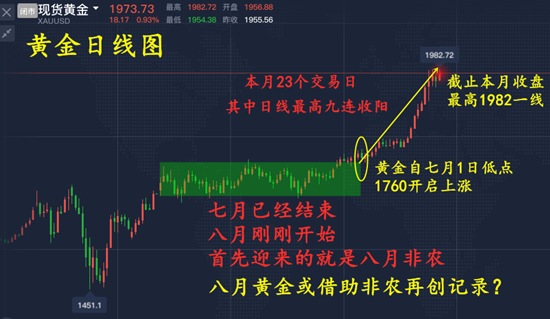 辰逸凛:七月已结束,黄金白银原油,这些交易机会你都把握到了吗? 七月在忙碌中离我们而去,也宣告了八月的正式开始,非农数据周也会如期而至。回首七月的行情,我想仅仅是精彩两个字是无法撰述的。或许这个阿娜多姿的七月,让有些人亏损连连,痛心疾首;也必然让有些人盆满钵满,喜笑颜开!这就是投资的魅力,有人亏损,肯定有人盈利。为什么盈利的不是你,你有想过吗? 一、金市开启新篇章:突破前高1921,上触1980关口! 7月黄金收于1970美元关口上方,当月累涨10.91%,创2016年3月以来最佳月度表现。前半月的行情平淡如水,但后半月紧张刺激,现货黄金日线斩获9连阳,从1800下方飙升近200美元,最高触