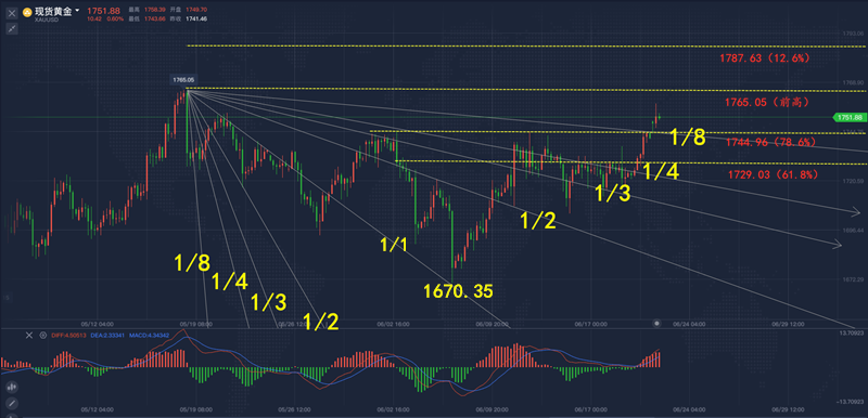 辰逸凛:黄金反弹遇阻,日线即将开启回落模式?中线空布局持有! 步履不停的追逐,会忽略路边花开的芬芳;迫不及待的握紧,会遗忘最初的理想。生活的意义,不是一味追求目标的到达,而是感受旅途的平坦崎岖。生活慢下来,心情就会更舒畅。交易慢下来,行情就会更清晰。 交易的结果,越是着急利润越是容易出错。想要快速盈利时的满仓重仓,想要把握机会时的提早进场,不肯认输时的逆势扛单,都是大亏损出现的根源。对利润越是淡薄,对思路的执行就会越坚定。简单的看待行情走势,执行既定的操作机会,虽然短期有盈亏浮动,长期却会有出乎意料的投资回报。 技术面上:6.22黄金后市走势分析及交易思路: 黄金早间提示本周1750/60/