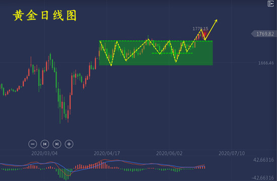 辰逸凛:众多风险事件齐袭,黄金走势别具一格!下周国际黄金走势分析! 授人以鱼不如授人以渔,以小博大是投资的真正魅力,拿住有把握的利润是理财之根本!投资本身就是一种对自身的修炼。不断的修炼,才能晋升为成功者的行列。想要走的更远,与谁同行才是关键,一个人能走多远,要看他有谁同行;一个人有多优秀,要看他有谁指点; 市场方面(6月22日至26日): 本周,黄金结束了一个非常令人兴奋的交易周。其中,受全球范围内疫情新增扩大的现象触发市场对经济复苏更为推迟的顾虑,刺激黄金多头续刷近8年高位,周内最高升至1779.10美元水平,逼近1780阻力位与1800大关,稳固了市场进一步看涨黄金的信心。 随后