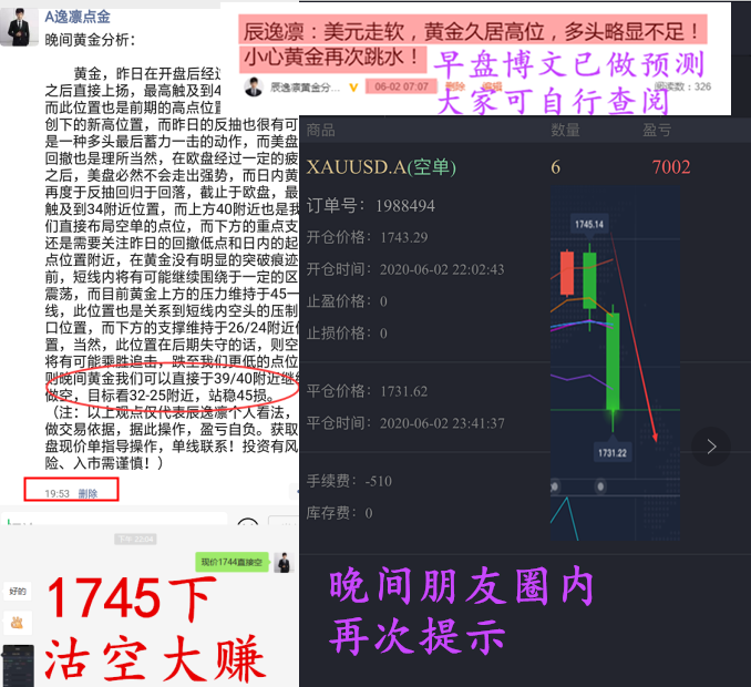 辰逸凛:黄金跳空高开,更大行情尽在本周!黄金后市走势解读! 一转眼,五月份就结束了,迎来崭新的六月,2020年就快到了年中,仿佛一年的工作才刚开始没多久,就已经有种到底的感觉,或者是因为今年的疫情原因。但不管如何,无非大家都在为了给自己这一年交一个满意的答卷,但是往往事与愿违,交易依然苦于亏损,如果你现在不作出一点改变,那2020年应该就不会过得那么舒心了。 现在,难得一见的机会来了!翻倍很难吗?我一直认为只要严格按照我的操作方式,不求一周翻倍回本,但长期保持稳健获利还是很简单的。 市场方面: 受避险情绪影响,周一(6月1日)国际现货黄金大幅跳空高开,金价一度突破1740美元/盎司。辰逸凛分