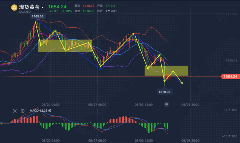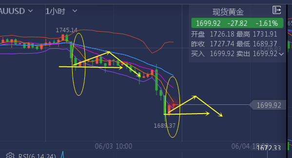 辰逸凛:黄金下行风险加剧,高空还将继续?波段抄底何时进行? 投资本身并没有风险,只有失控的投资才有风险; 五流的操盘手比技术,四流的比资金管理,三流的比理念,二流的比心态,一流的比训练及综合素质。 做黄金,无非买低卖高,卖高低抛,地价进天价出,所谓的高低价只是你自己的一个定义,价格不重要,重要的是方向。在这个市场里无论是被套还是亏损都是非常常见的事情,我们首先要学会找到亏损与被套的原因,之后想出解决的方法,最后则是总结经验教训,避免重蹈覆辙的可能,只有做到了这三点,我们才能减少发生风险的可能。 市场方面(黄金短线为何急跌): 国际现货黄金周三(6月3日)跌幅一度超过40美元,美市盘中最低触及