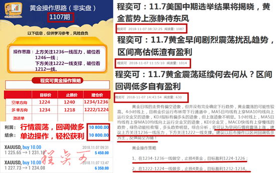 程奕可:11.8黄金多空交替震荡不改,区间高空布局有盈利 黑夜无论怎样悠长,白昼总会到来,震荡无论多么持久,破位总会光临。即使预期如何美好,有时就会破灭,没有底线的博弈是可悲的,不设止损的扛单是可怕的。当你的希望一个个落空,你也要坚定,要沉着,世上没有绝望的处境,只有对处境绝望的人。勇于突破绝境方能成就自我,敢于主动操作才会有所收获!静待黎明,不如寻找光明。等待行情,不如主动出击。 精准策略回调低多,两单获利10000美金 策略多精准,行情来验证!昨日行情开盘上涨后急跌回调,白盘区间震荡上涨,晚间遇阻震荡回落。奕可ADP后加上768早间建议区间内以回调低多为主,反弹高空为辅。早间实仓客户李先