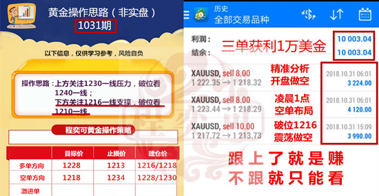 程奕可:11.1黄金多头卷土重来行情上涨有望,精准布局10点盈利随手拿 投资者朋友,早上好!十月结束,新的一个月来临,市场也越来越繁荣。成功需要有目标,那么再十一月你的目标又是什么?跟上奕可的脚步,让我带你领略投资的精彩、享受盈利的喜悦。请大家记住我,始终活跃在黄金市场一线的程奕可! 精准策略顺势做空,三单获利10000美金 策略多精准,行情来验证!昨日行情再次震荡下跌,奕可ADP后加上768近几日一直强调操作反弹高空为主,回调低多为辅。实仓客户金先生在奕可的指导下,凌晨1点左右在1223附近布局空单,早间开盘又在1222附近加仓空,午间行情下破1216一线,随后反弹至1218附近,奕可建议