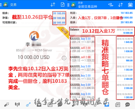 程奕可:11.4黄金一周获利39个点,实仓2倍翻仓,你还在等什么? 不去耕耘,不去播种,再肥的沃土也长不出庄稼,不去奋斗,不去创造,再美好的人生也结不出硕果。你看到了别人的成功,却从不关注他的努力。你羡慕他人的收获,却从不关心他的付出。在黄金市场中,有人盈利,有人亏损。你可以毫无损失的在一旁观看,但你也失去了获利的资格。努力奋斗才会获得成功,勇于投资方能创造财富。 精准策略,10单无损获利39个点 随着一周行情的结束,奕可ADP后加上768来总结一下本周的战绩。自周一开始行情不断下跌,至周四行情暴涨,周五非农行情来回震荡。周一做空,一单盈利3个点。周二多空双赚,两单获利8个点。周三连续做空,