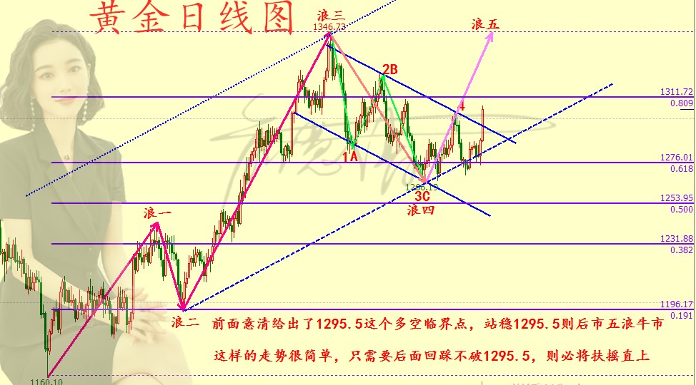 俞意清:6.1金油周初精准分析,在线解单,前两名免费! 究竟什么样的终点,才能配得上这一路的颠沛流离,堆积了多少无可奈何和无能为力,才会想通和顺其自然。投资之路坎坷曲折,引 千万投资者饱受切肤之殇 ,百转千回只为了最初的盈利之念,不变的初心,只有稳健的获利才能让我们倍感亲切,真切的明白投资的意义。 1、话不多说,先看黄金日线走势图(如下): 周五意清明确指出1295.5这个多空分水岭,破位则五浪成立,迎来大涨,最高上冲到1307一线。接下来周初因为超买的严重或将迎来回调与修正,这个时候我们只要看到1295.5守住,那就大胆做多,上看1320-1346,破位则看1358