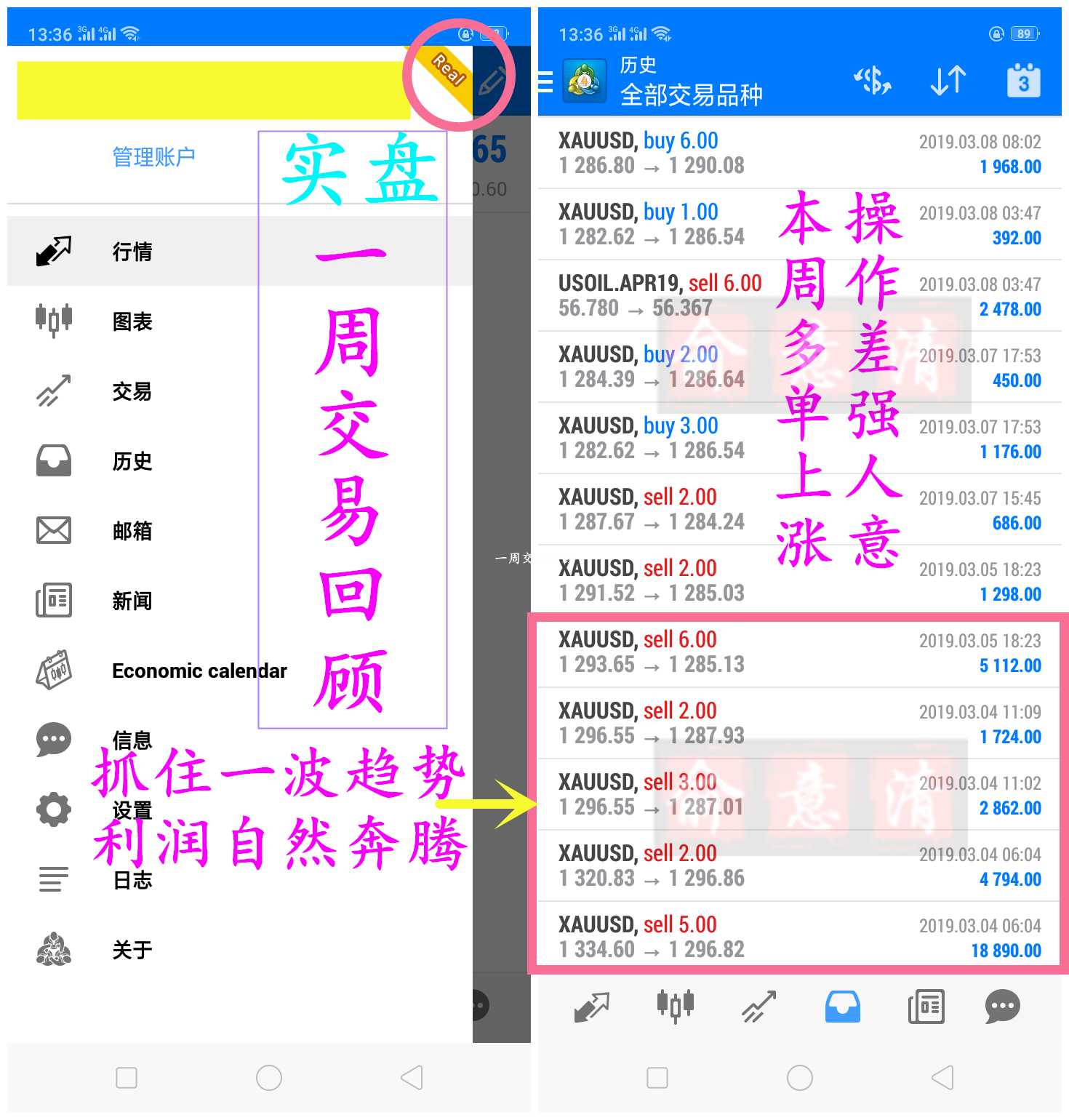 俞意清:3.10黄金多头崛起在即,空单持仓如何自处 爱过,又失去爱,胜于未爱过。市场不会让人害怕,害怕的是不少人入场之后等待那种未知的时候,就像亏损并不可怕,丧失交易的热情才是最可怕的。俞意清 违心(yyq346) 我是俞意清,这个市场想要盈利说简单也简单,难也特别难,用心可以了找到一个可靠的老师,受益终生。 1、一周交易回顾,黄金周盈利 这一周下来做出如下统计,交易13单,获利44580美金,其中最大的盈利在于空单波段的完美布局,后面的即一天虽然利润也不少,但是没有抓住最大的头也是一个问题所在。意清做单严谨细致,只有最严谨的分析,考虑到承担的风险再去谈利润,有些单子风险太大所以并