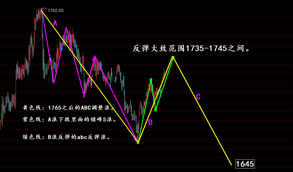 黄金经过几天的高位盘整,于周二直接跌破1727的位置,周三借助ADP数据直接出现大幅回落,整体走势在我们的预期之内,最近因为整体还1693-1765的大区间震荡,所以我一直没能有很好的意见,更不能说我以我自己的倾向去交易,我觉得这是对大家不负责任的表现,特别是在这种大区间震荡的时候,再去说倾向某某某方向,我觉得并不大好,但从周二白盘开始就一直在建议做空,最终也是顺利下跌了,因为这个下跌,那么距离我前面所说的ABC下跌结构又进了一步,若后市一旦日线收在了1693下方,我觉得看到1645位置是没问题的,但是这里提醒一句,哪怕跌到了1645的位置,那么下跌结束之后,是要重新进入涨
