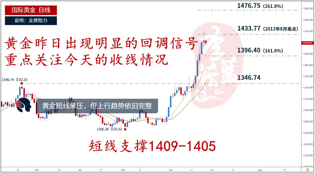 李菘蓝:6.26黄金能抄顶了吗?今日黄金如何操作?黄金后市分析 行情跌了,昨天直接一根大阴线跌了14美金,现在又回到了1410的位置,希望的是没有高位追多还不带止损的朋友,如果你确实高位追多没带止损,也希望你的仓位比较轻,不然基本你可能就扛不住这次行情的回调,上周四,周五我也看到了很多人选择在1393,1411的位置去抄顶,结果并不如意,结果好不容易改变了抄顶做空思路,现在似乎又错过了最佳的时机,没事,能够把握接下来的行情就好,关于今天黄金走势如何分析呢? 昨天因为行情比较大的原因,建议了4单,早上1424的多,1430的多单,以及回踩下来之后1424的多单,以及美盘1