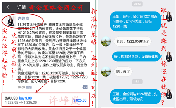 许峥岚:11.29席卷黄金市场,盈利一把抓!空单被套何解? 大家好!我是许峥岚!恭喜大家跟.上峥岚稳健获利,金融市场的魅力就在于,找.对方向,跟.对人,你的收获远远超出你想象,市场的机会是留给能抓住机会的人,方向不对,努力白费,峥岚一直坚信,能够带.领投资的朋友们,在金融市场里持续盈利下去,哪怕短时间的亏损,也影响不了我们长久稳定盈利的事实! 我一直想传达给大家的就是一种观念就是做单做的是一种趋势,大方向把握准确不去低位追空高位追多,获利及时出场。毕竟这盈利是从天而降的!那么对于峥岚所抓到的盈利,必须是靠实力来获得的。 第/一单,峥岚在1214位置介入空单,空单进场的理由,周二的暴.跌过后反