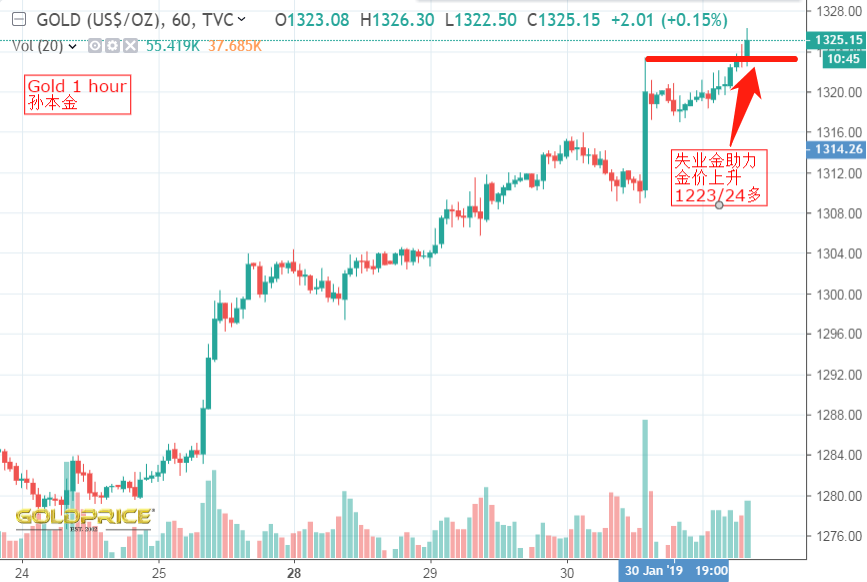 北京时间2019年1月31日21点30分,美国至1月26日当周初请失业金人数(万人)前值:19.9,预期:21.5,公布:25.3修正:20(前值),由于失业金数据助涨金价上行,美元指数DXY短线下行,报95.29;美元兑加元USD/CAD短线下挫30点,现报1.3137。我们成功在1223附近入场,等待上涨时机,行情也正向我们预期的方向发展,至作者发稿,离进场位上升2美元,报1326美元.事实上,此次数据涵盖了马丁路德金纪念日期间。尽管节日期间数据存在不稳定性,但数据的大幅上升还是说明就业增长在放缓。数据增长同时也反映出在政府关门期间非政府雇员可能会暂时性失业。 老铁没毛病,跟着节奏走,多