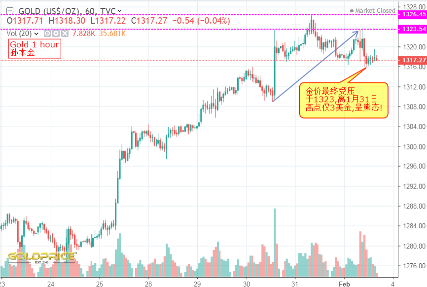 上周美国劳动力市场数据导致DXY的剧烈波动,导致下周一开盘涨跌互现,即将到来的Markit和ISM制造业采购经理人指数又将何去何从?数据显示,1月份非农就业人数增加了304000,超过市场预期的165K,黄金最终跌至1317.49美元收盘。然而,随着该报告的其他细节显示,劳动力市场的一些潜在弱点,数据公布的晚些时候,金价在1316美元至1323美元区间来回震荡,最终多头不敌空头势力,最终当天以上升0.02%日线呈小阳而靠一段落,下周一的操作将何去何从,我认为不仅应当从前面的五连阳分析,上周日线收阳已经给出上升信号,但由于在周初金价的疲软和市场无其他数据的推波助澜,导致金价周一始终维持在区间1