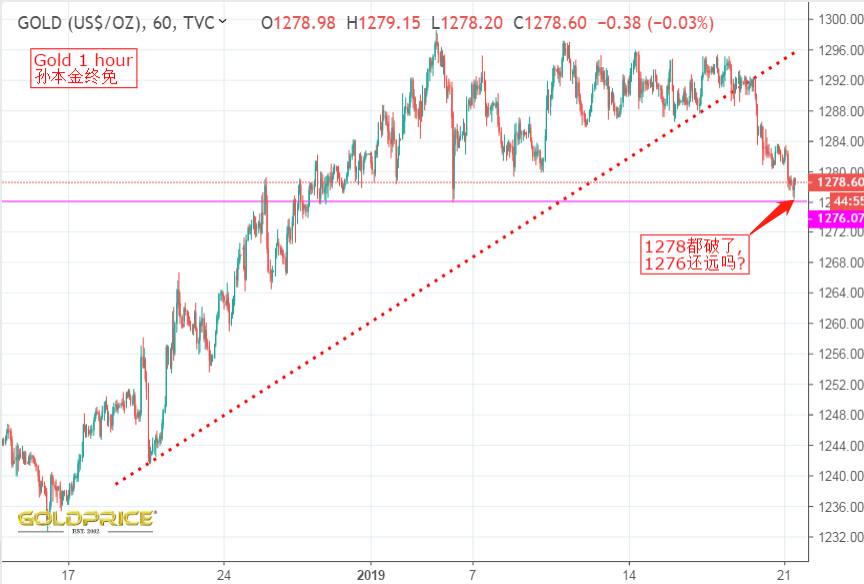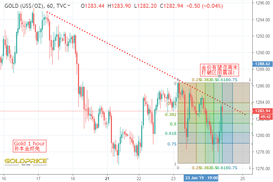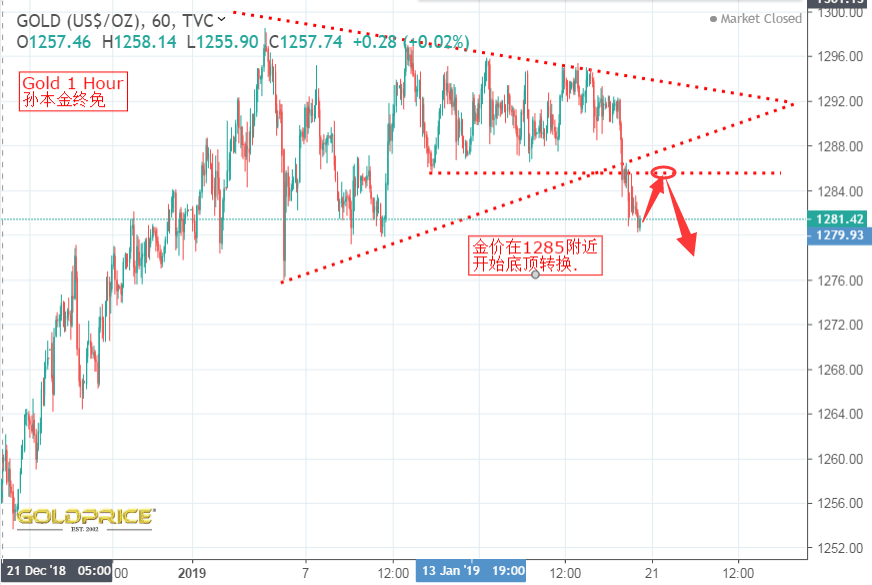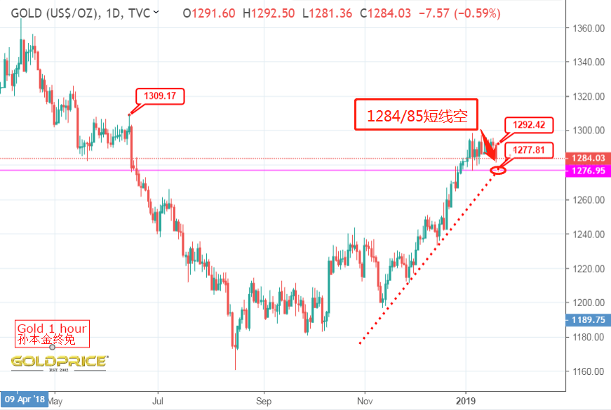 关键还是要看周末,周末的夜晚最迷人,之前说好的三角区间震荡, 金价 只有打破三角区间才有可能继续上行或下跌,果不其然,在一个夜深人静冬天的夜晚,经过长达二至三周的多空拉锯战,终于在本周尾,天空划破一道长空,金价开始从1276触底,一柱擎天,chua chua chua的上涨,使得我们昨天在1276/75做多看涨的布局得以实现,最主要的做多信号还要归功于,金价在美盘突破1286美元,也就是1月23号周三的高点,基本可以证实 黄金 突破阻力,上升信号确认,追多成功. 另外,未解决的美中trade争端,美元再度疲软有助于黄金重新获得上升动能。普遍的风险情绪和美国国债收益率受到阻碍。黄金在欧盘时段保