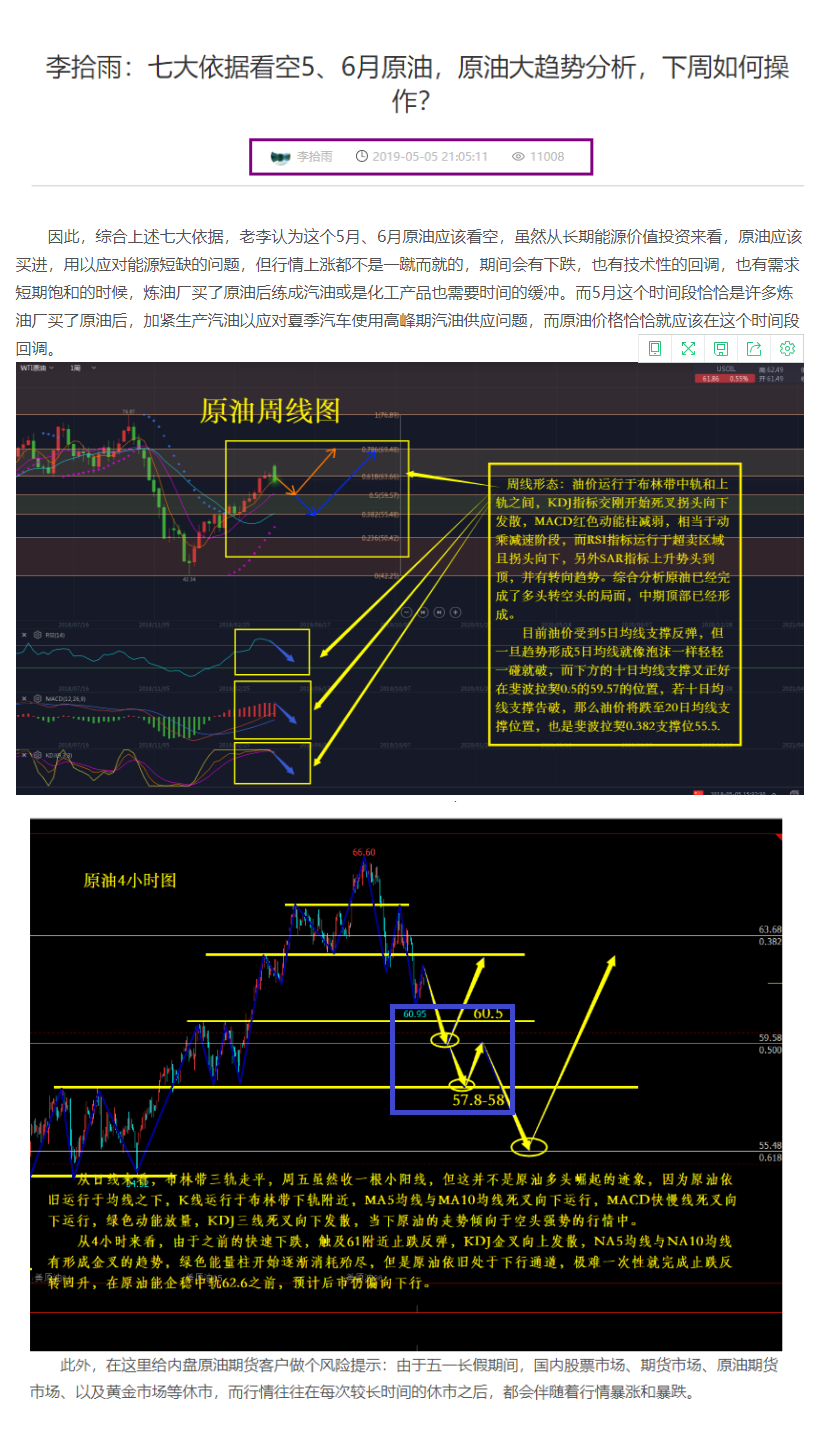 这是一个让人无法黯然入睡的一个晚上,包括拾雨也是,许多朋友的账户不是被.套,就是爆仓,本来地缘政治危机升级,欧佩克减产效应,把油价牢牢往多头方向支撑。 但经过昨晚美国EIA库存大幅增加,以及欧佩克5月减产效果不佳,另中国及印度减少原油进口,这无不在表现出原油市场需求端口出现疲软;此外,今日南阳水氢气发动机成功下线,给与了本来略显颓势的原油一个暴击,让原油暴跌6%而不显疲态。 这样的一个大单边暴跌行情让很多人都没有丝毫的准备,随之而来的是市场中爆仓之声接连而来,或是牢牢套在了高位。 而市场的每次大行情都会造就一批人,再毁灭一批人,把握住这波行情的朋友喜笑颜开,错失的人黯然神伤,在这个市场没有常