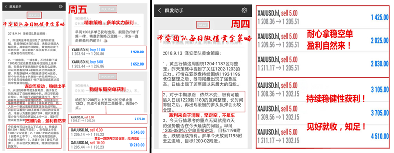 乔泽安: 9.16黄金一周实力斩获73W详解,再布局百万只待你来! ——周五操作回顾:稳健布局,实力获利 14W—— 周五收官之战也是大家一直说的黑色星期五,在这场战役中,跟上操作的朋友都是收获不少,至少比较明显的就是实仓朋友的账户又多了一笔收益。周五操作思路十分清晰,因周四走出倒V行情,行情一度偏弱 ,早间泽安先看反弹,在 1203附近 支撑给出多单进场的建议,下午欧盘快结束时上涨至1207附近获利出局,反手就在1208压力附近空单进场,看破千二,在美盘开盘不久开始一路跌,中间就加仓两单空单,跌至千二支撑附近时,1208附近的空单止盈1202。之后持续跌破千二,到 1195附近时立刻止