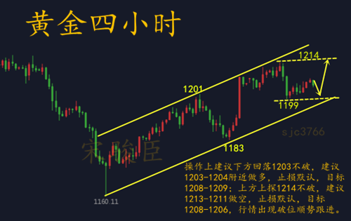 黄金全天在线布局策略: 黄金早盘盘面反弹测试 1208并未上破, 骏臣 预计今日黄金将延续昨天的反复洗盘走势,操作上暂不着急进场。黄金的偏强震荡节奏已经确定,主多操作思路,但是谨防来回反复走势,下方关注 1198-1200支撑,到位成功支撑可做多。 技术面上分析来看,黄金日线图上收取一根小阳线, K线运行于MA5均线一线,MA10均线及布林中轨于1199附近形成关键支撑,MACD指标于0轴下方维持金叉向上运行,红色量能维持放量,指标强势,日线走势整体企稳于千二关口上方,处于偏反弹格局中;4小时图上,布林带指标区域走平运行,K线运行于布林中轨及MA5/MA10均线处,布林下轨于千二关口附近形成