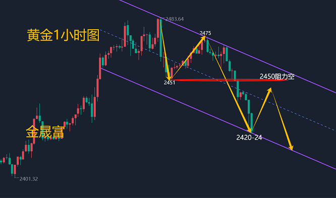 换资共勉: 黄金周四周五连续下跌,两天跌幅已达80美金,此前上行趋势完全被破坏,多头大势已经退去,空头趋势已经形成,并且仍然占据主导地位,周五日内连续做空继续暴赚,思路很明确反弹就是空,相信很多人都抓住了这场机遇,没赚到马内的朋友值得反思自己的操作手法!这个市场里向来都是先知先觉者吃肉,后知后觉者喝汤,不知不觉者垫底,方向点到为止,我们不需要在当下用言语争辩不休,雁过留声,只需等待潮水退去方知谁在裸泳! 近期有哪些消息面影响黄金原油走势?下周黄金趋势看涨看跌? 在周五的市场交易中,黄金价格经历了一次显著的回调,跌破了2400美元/盎司的重要心理关口。