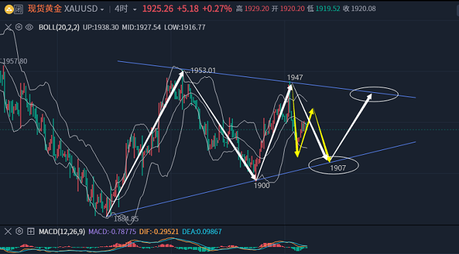 近期有哪些消息面影响黄金原油走势?周线收官黄金走势何去何从? 周五(9月22日)亚市盘中,现货黄金在昨日重挫后小幅反弹,金价现报1925美元/盎司附近。 现货黄金周四收市下跌10.37美元,跌幅0.54%,收报1919.80美元/盎司。美联储周三如期维持利率不变,但为今年剩余时间内再加息一次打开大门,这令美元继续走高,金价周四最低跌至1913.91美元/盎司。在美联储加强利率鹰派立场后,金价周四延续跌势。美联储周三维持利率不变,但其最新的季度预测显示,今年可能会再次加息,并在2024年之前保持利率紧缩。根据CME FedWatch工具,虽然市场预测今年再次加息的可能性为45%,