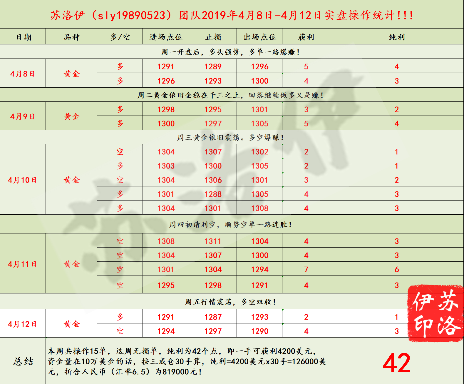 君行千里我相送,君到跟前我相助,市场利润十分,我愿倾尽全力为你独取九分,实力让我有此底气,青海长云暗雪山,不破楼兰终不还。大家周末好!我是你们的老朋友苏洛伊。一周交易又结束了,不管上周大家收获如何,洛伊都希望大家在这个周末,好好休息,出去跟朋友吃吃饭喝喝茶,散散心。行情的事情就交给我苏洛伊来为你们分析好了。 一周交易复盘,本周轻松收割42点利润,你跟上了吗? 今天是周六,洛伊吃完晚饭,又像往常一样,开始自己的一周工作总结了,说起本周的行情,算是大起大落,但是回想起本周洛伊带实盘学员操作的情况来看,还算是顺利的。本周共操作了15单,共获利42点利润。在这里,洛伊想说,再好的行情没有实力怎能达到