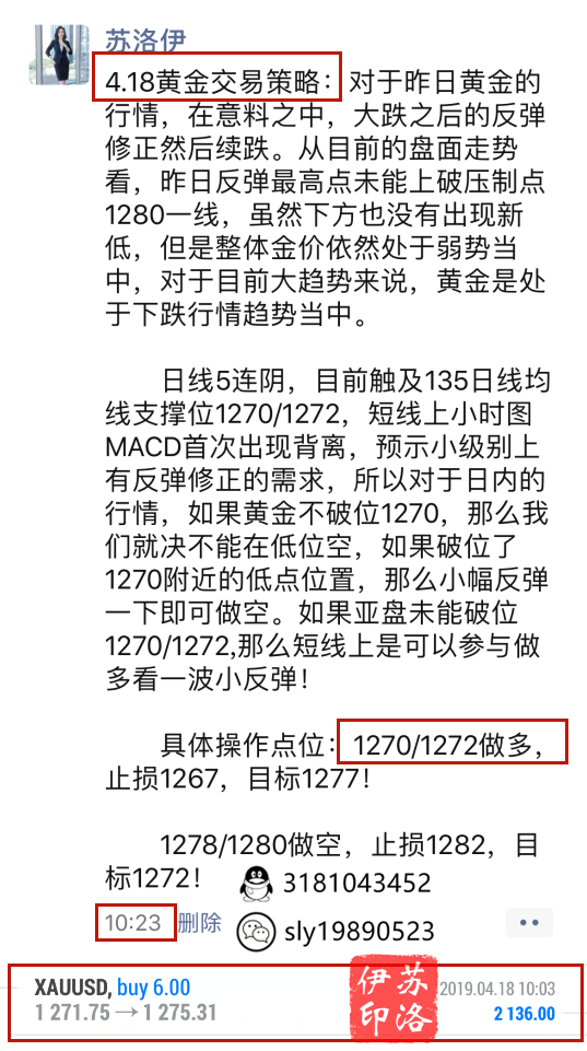 君行千里我相送,君到跟前我相助,市场利润十分,我愿倾尽全力为你独取九分,实力让我有此底气,青海长云暗雪山,不破楼兰终不还。大家下午好!我是你们的老朋友苏洛伊。择一良人奋不顾身,择一良师扭亏为盈,如果你还在市场彷徨失意,现在找到洛伊也不迟! 实盘现价喊单,多空稳赚,私聊教你完美盈利! 今早黄金开盘即涨的行情,相信很多有操作的朋友们,应该都有了解,洛伊也是及时让自己实盘上周布局的多单及时获利出局,这里要说明的是单子持仓过周末的原因是上周五的停盘。多单顺利在1279附近止盈出局。一单也是稳赚1000多美金!上午黄金的涨势并不猛,洛伊看到涨到上方阻力位附近,及时让自己的实仓在1279附近布局空单,下