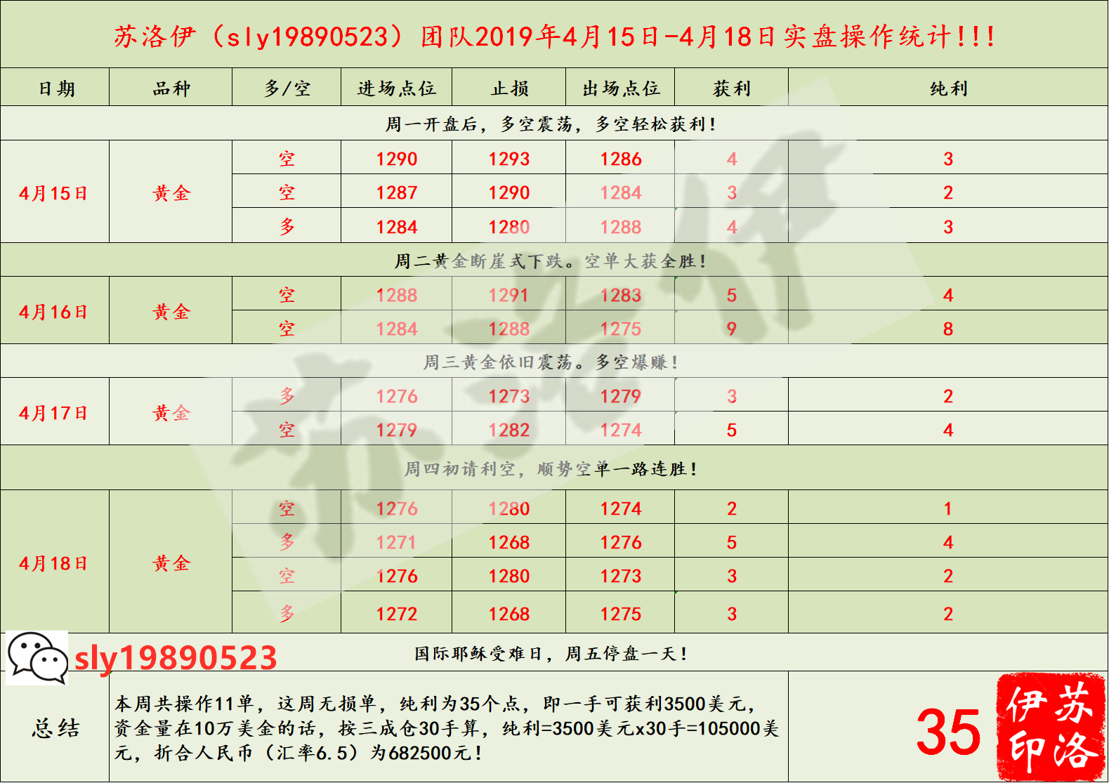 君行千里我相送,君到跟前我相助,市场利润十分,我愿倾尽全力为你独取九分,实力让我有此底气,青海长云暗雪山,不破楼兰终不还。大家下午好!我是你们的老朋友苏洛伊。一周交易又结束了,不管上周大家收获如何,洛伊都希望大家在这个周末,好好休息,出去跟朋友吃吃饭喝喝茶,散散心。行情的事情就交给我苏洛伊来为你们分析好了。 一周交易复盘,本周轻松收割35点利润,你跟上了吗? 今天是周六,洛伊吃完中饭,又像往常一样,开始自己的一周工作总结了,说起本周的行情,算是大起大落,但是回想起本周洛伊带实盘学员操作的情况来看,还算是顺利的。由于周五是国际耶稣受难日,所以停盘一天,本周共四天操作,本周共操作了11单,共获利