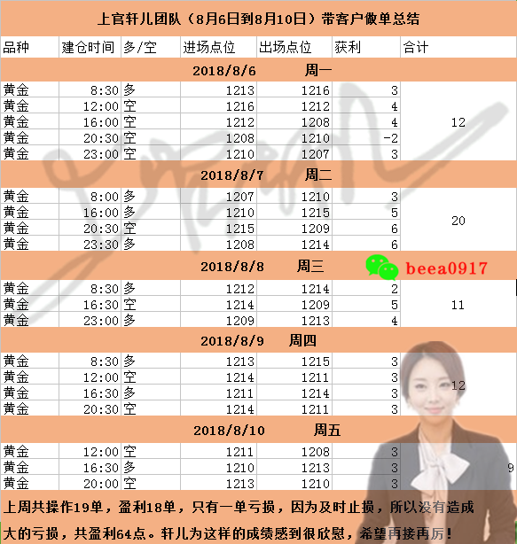 轩儿导语—— 人心就像一个容器,装的快乐多了,烦恼自然就少;装的简单多了,纠结自然就少;装的满足多了,痛苦自然就少;装的理解多了,矛盾自然就少;装的宽容多了,仇恨自然就少。胸襟决定器量,境界决定高下。交易就是一种修行,修行就是修心,修得一颗平常心,不为止损而抱怨,修得一颗满足心,不为获利而自满。周一愉快!我是你们的老朋友上官轩儿,一个愿与你们同舟共济的分析师。 顺势盈利频频爆赚,你要的利润轩儿都给你! 上周行情一直处于区间震荡的趋势,很多朋友们都认为行情不大,也不会有很大的利润,但是轩儿想说你想错了,轩儿胃/锌beea后面加上0917很早就预感后市行情将会弱势下跌,轩儿提